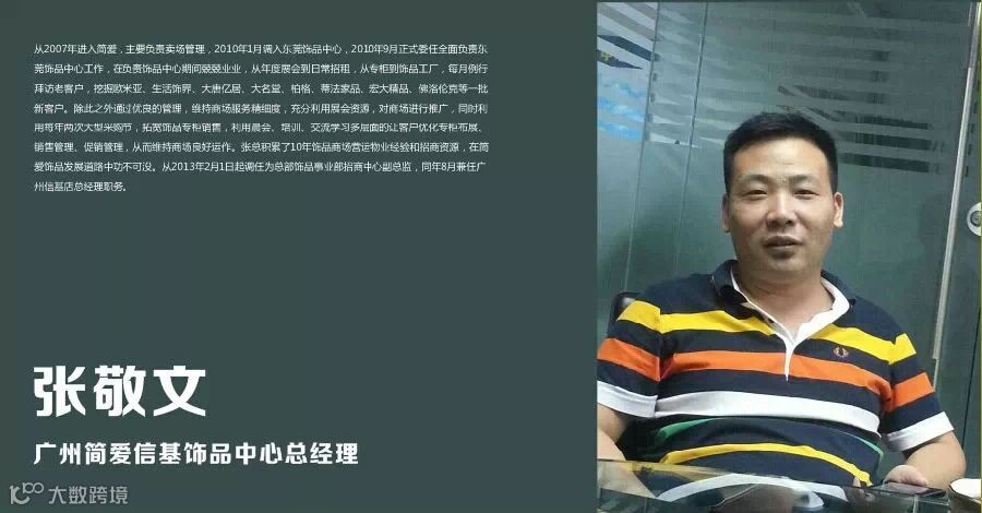 从2007年进入简爱,主要负责卖场管理,2010年1月调入东莞饰品中心,2010年9月正式委任全面负责东莞饰品中心工作,在负责饰品中心期间兢兢业业,从年度展会到日常招租,从专柜到饰品工厂,每月例行拜访老客户,挖掘欧米亚、生活饰界、大唐亿居、大名堂、柏格、蒂法家品、宏大精品、佛洛伦克等一批新客户。除此之外通过优良的管理,维持商场服务精细度,充分利用展会资源,对商场进行推广,同时利用每年两次大型采购节,拓宽饰品专柜销售,利用晨会、培训、交流学习多层面的让客户优化专柜布展、销售管理、促销管理,从而维持商场良好运作。张总积累了10年饰品商场营运物业经验和招商资源,在简爱饰品发展道路中功不可没。从2013年2月1日起调任为总部饰品事业部招商中心副总监,同年8月兼任广州信基店总经理职务。