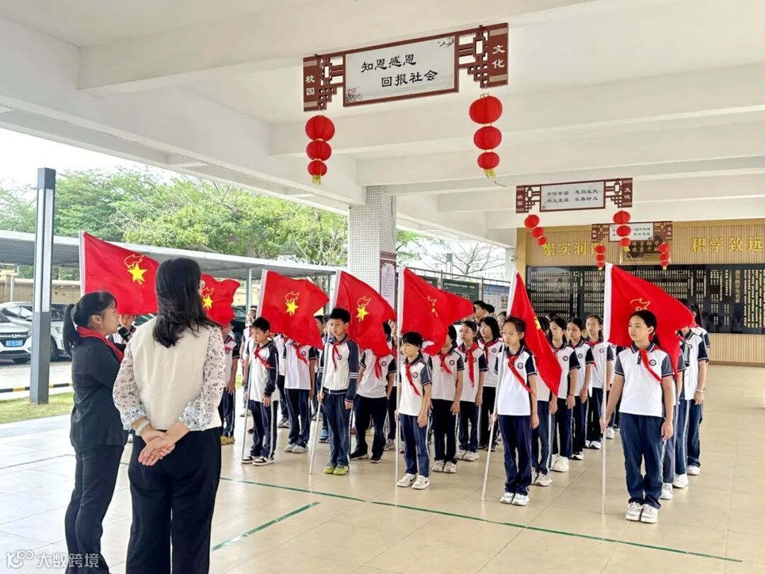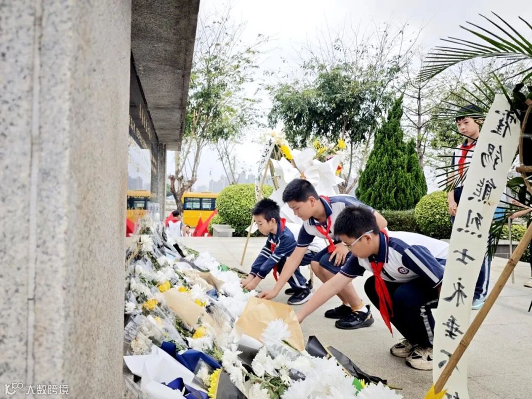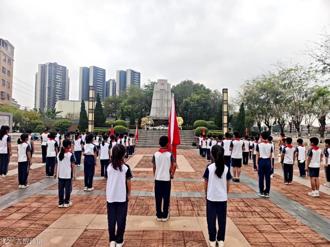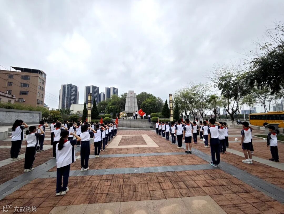 当日下午,少先队中堂镇槎滘小学大队四年级的53名少先队员身着整齐校服,胸前飘扬着鲜艳的红领巾,怀着崇敬与追思之情,在德育主任伍慧婵和少先队大队辅导员刘彩云老师的带领下,坐校车到霍锡熊烈士纪念广场。
