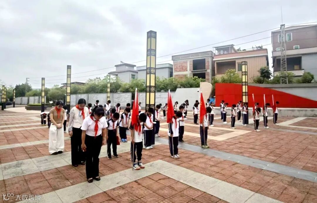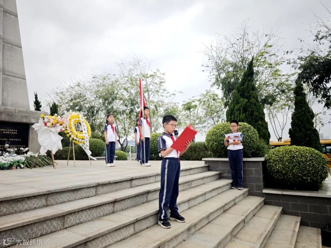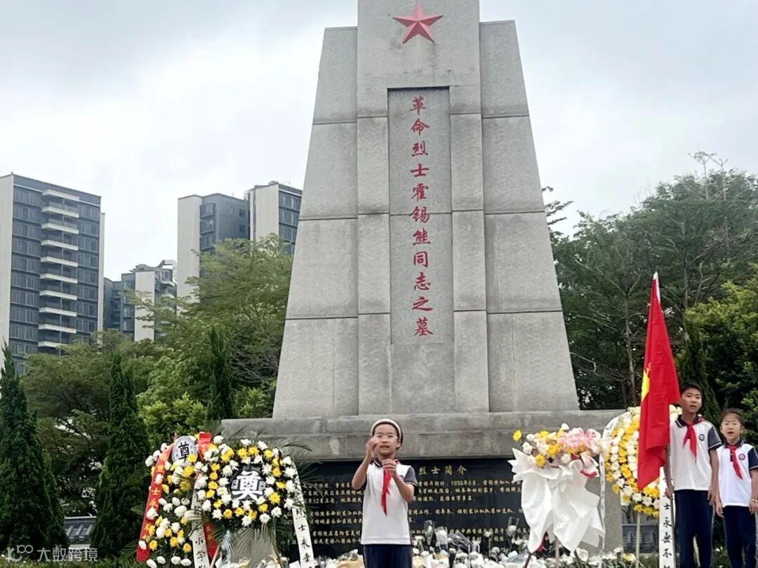 烈士故事讲解环节,队员们聆听少先队员代表黎司言宣讲霍锡熊烈士的一生英勇事迹:“霍锡熊烈士为民族独立和人民幸福献出了宝贵生命,他的精神如同这座丰碑永远屹立。我们定会珍惜来之不易的幸福生活,以先烈为榜样,勤奋学习、强健体魄,长大后为祖国建设贡献力量!”稚嫩却坚定的声音道出了全体队员的心声。紧接着,大队辅导员刘老师带领全体队员重温入队誓词:“我是中国少年先锋队队员,我热爱中国共产党,热爱祖国,热爱人民……”铮铮誓言响彻云霄,少先队员们高举右拳,目光如炬,将“为共产主义事业贡献力量”的信念深植于心。仪式最后,队员们手捧亲手准备的小白花,绕墓一周依次献花,以质朴的方式寄托哀思,传承红色精神。活动全程,全体师生着装规范、言行庄重,圆满完成本次活动。