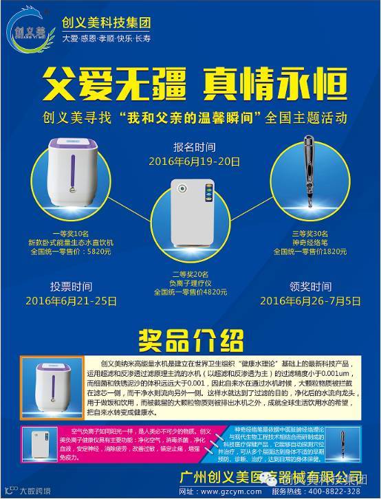 父亲节快要到了,父亲多年来为了家庭默默付出,总在我们最脆弱或是遭受挫败之际,伸出那双粗糙有力的厚实的大手,投掷深沉关爱的目光默默支持。创义美为唤起儿女对父母的关爱,弘扬中华民族的传统文化。用实际行动感恩父母,孝顺父母,关爱父母健康,让他们安享晚年,特策划此次活动。同时,更是以价值5820元的新款卧式能量生态水直饮机、价值4820元的负离子健康仪、价值1820元的神奇经络笔这些中老年健康产品作为活动奖品。希望用实际行动得到更多的人的关注和传播。让更多人了解创义美五化精神,共同传播社会正能量。