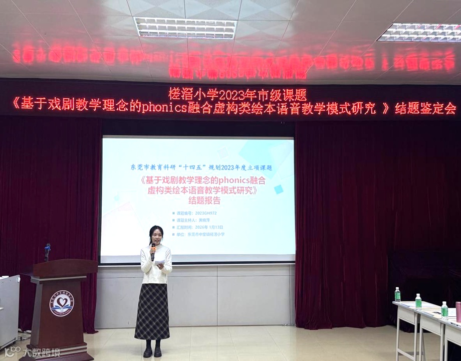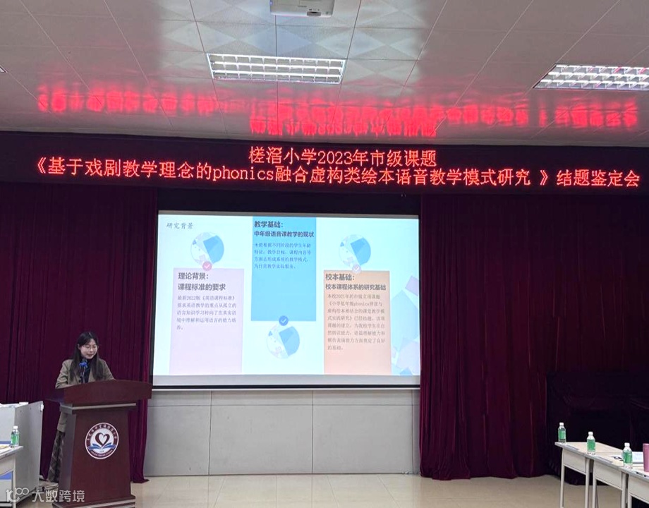 课题主持人黄晓萍老师从研究背景与现状、核心概念与目标、过程与方法、核心成果、创新点及反思展望六大板块作结题汇报。该课题立足小学英语语音教学痛点,契合课程标准要求,依托学校校本研究基础,采用文献研究、行动研究、案例分析等方法,分三阶段推进研究,构建了“戏剧 + phonics + 绘本”三位一体教学模式,积累了丰富教案案例,学生语音能力显著提升。