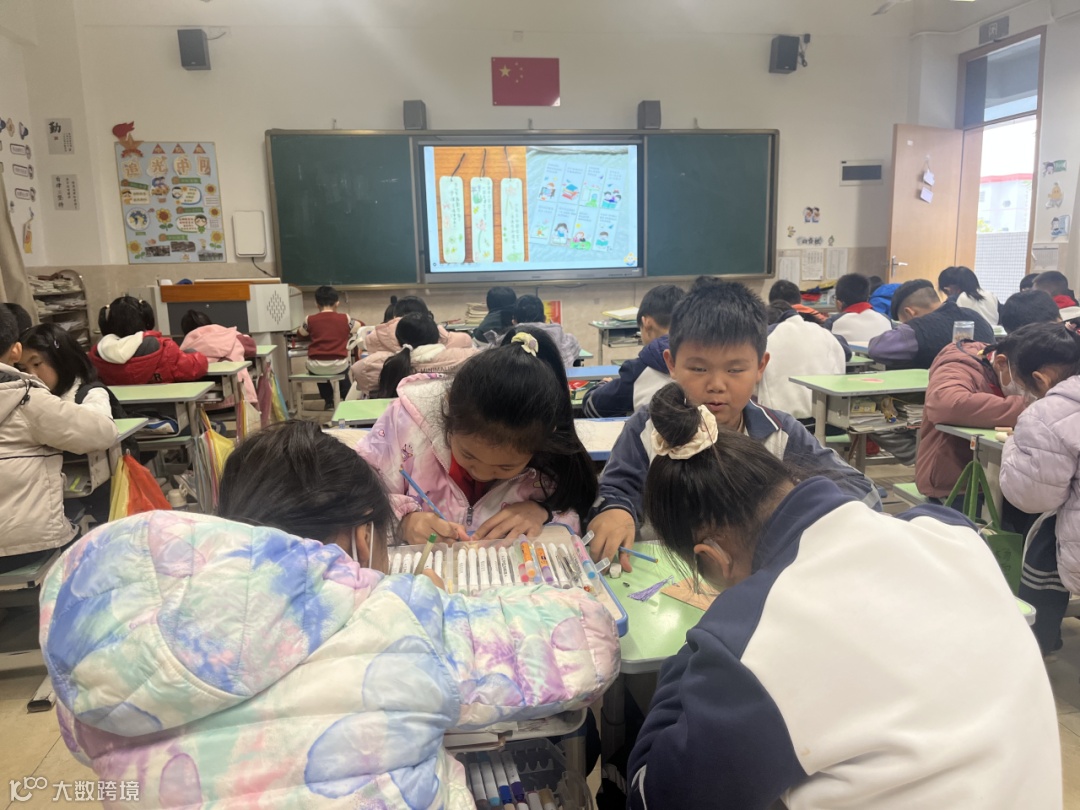 三、四年级的孩子们,则将注意力聚焦在阅读基础能力的培养上,纷纷找好座位,静下心来制作精美的读书推荐卡。课桌上,彩笔、剪刀、胶水、彩纸整齐摆放,孩子们先认真回忆自己读过的好书,眉头微蹙、若有所思,确定推荐书目后,便拿起彩笔开始创作。