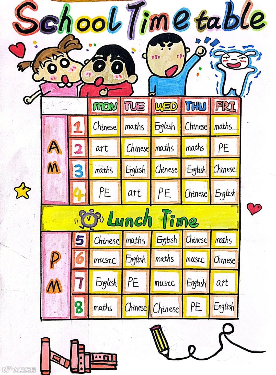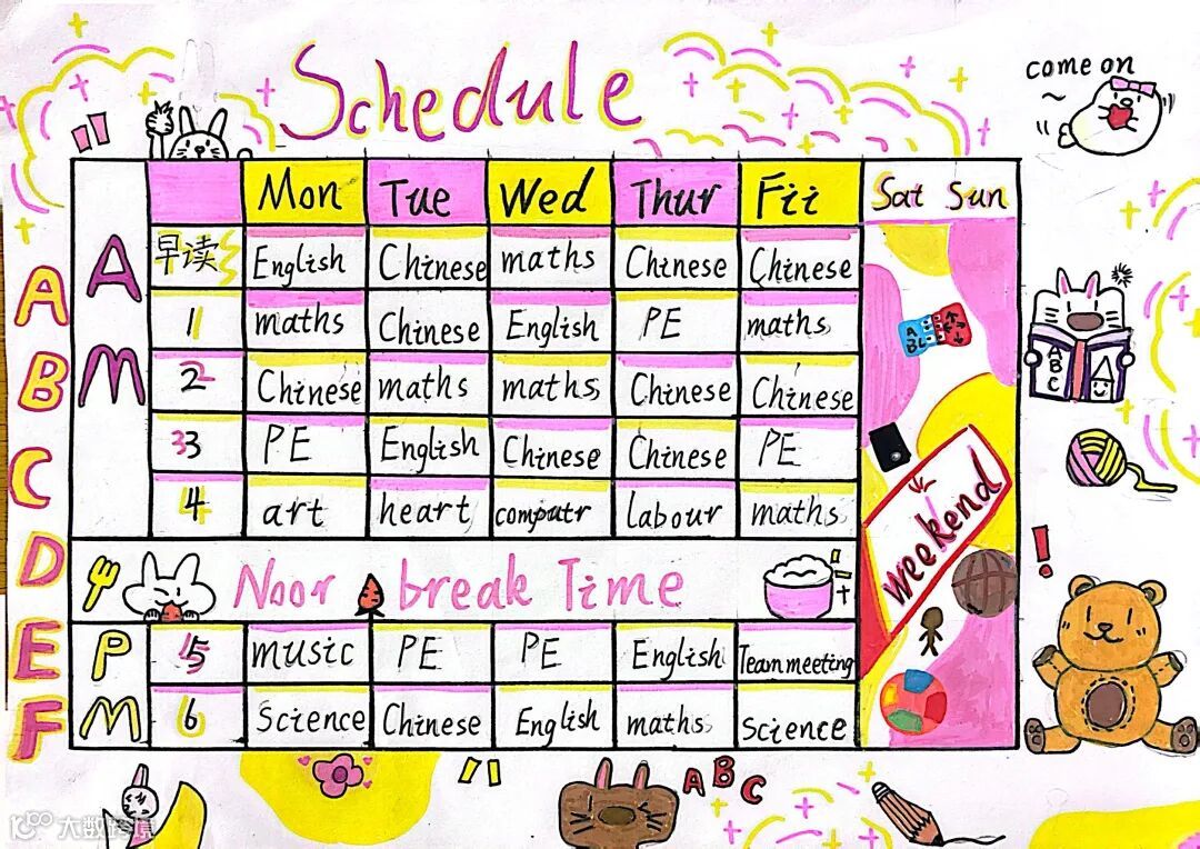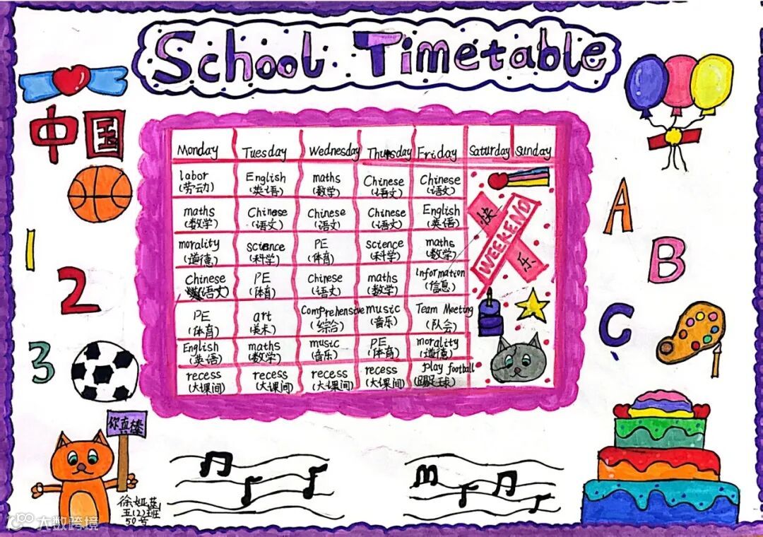 五年级创意课程表打破传统格式,孩子们根据喜好设计独特板式,用英语单词清晰标注课程名称,既梳理了英语知识,又展示学生的创意画作,实用与趣味兼具。