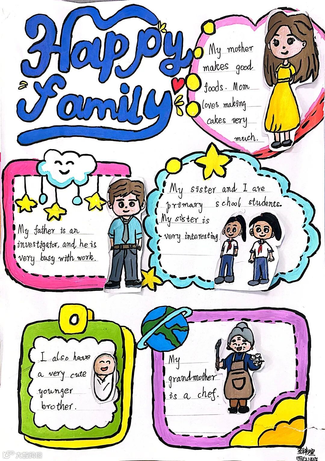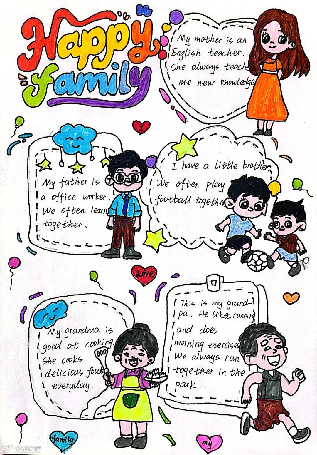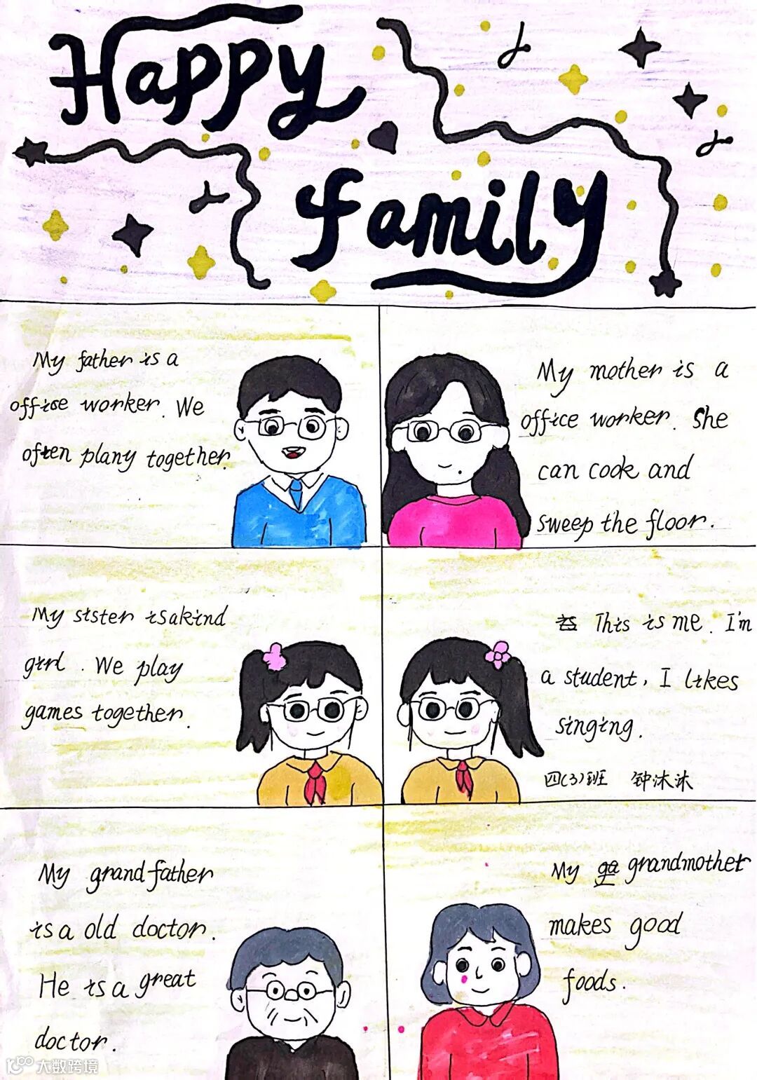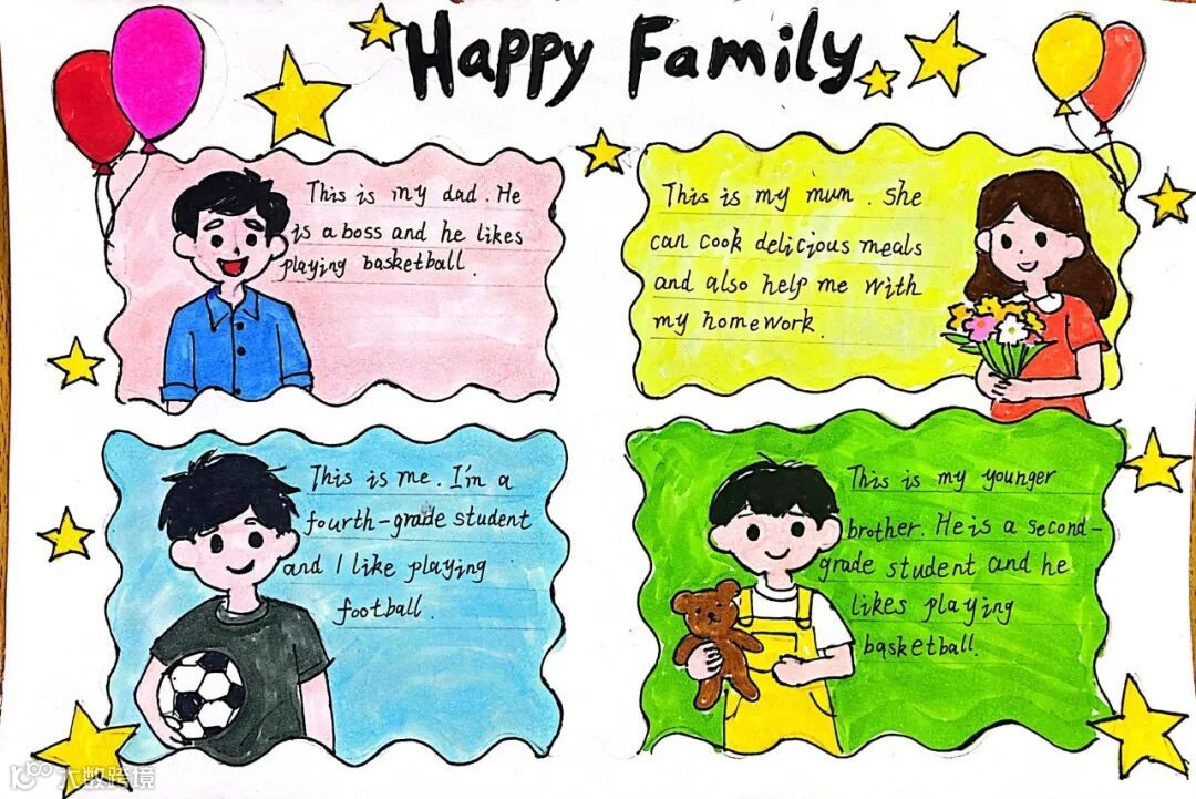 四年级家庭成员海报满含童真与家庭温情,孩子们用心勾勒出家人模样,搭配准确的英文称谓与个性介绍,传递对家人的满满爱意,这是专属家庭的温暖记录。