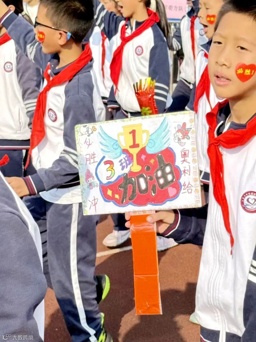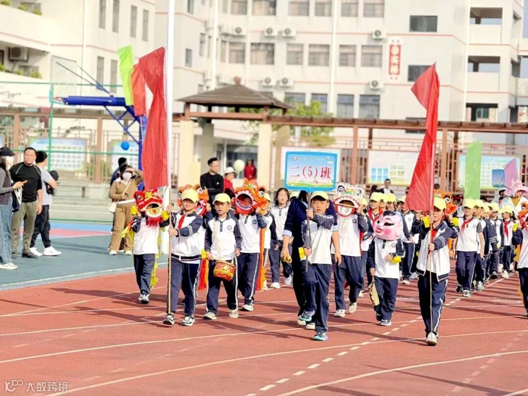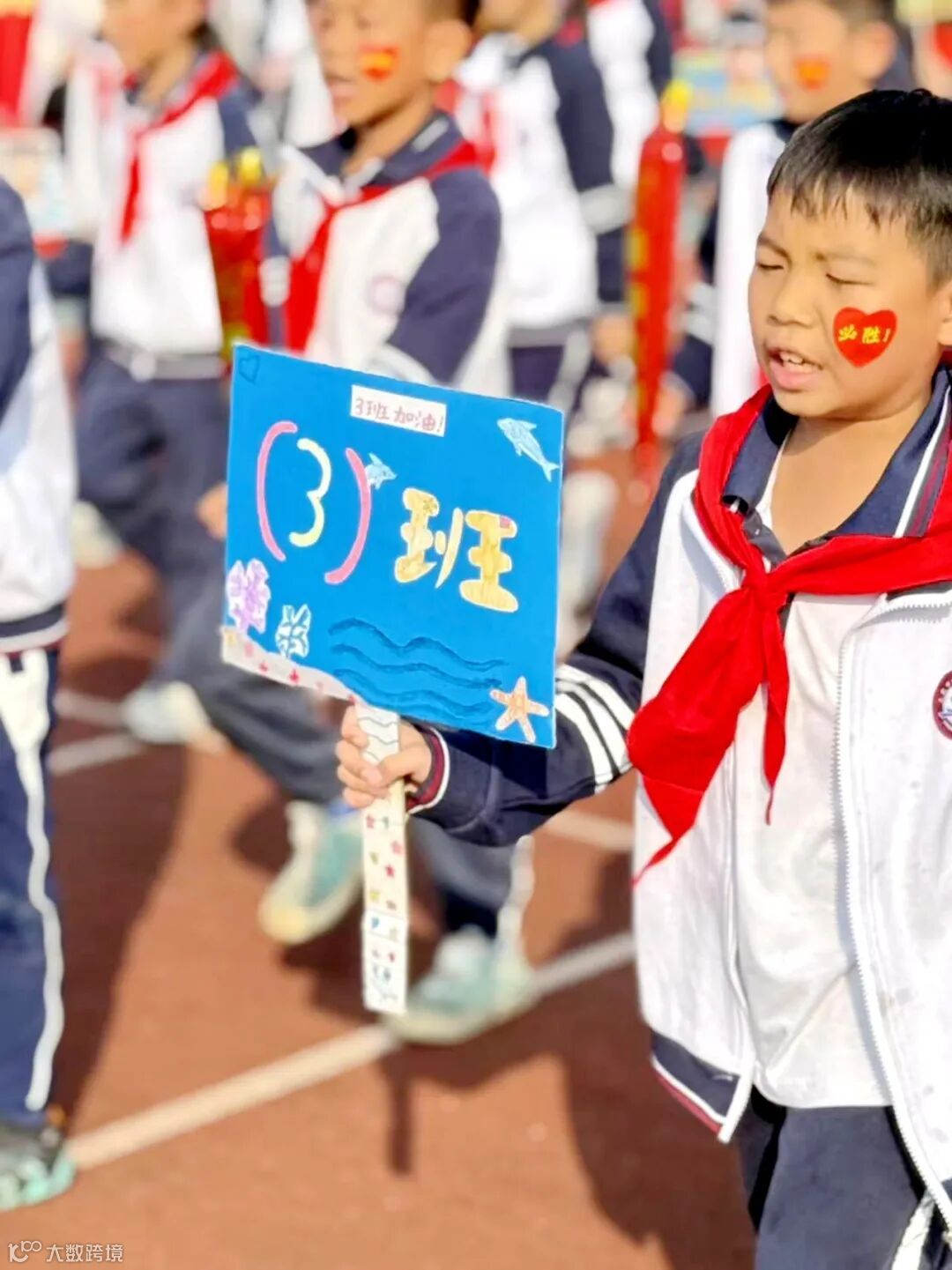 五年级方阵手持自制的创意道具,结合班级特色口号,尽显少年风采。
