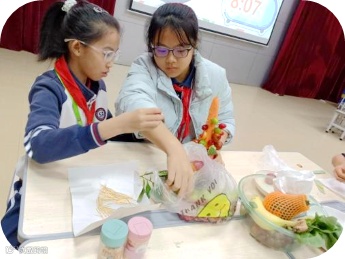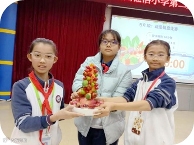 这里是色彩与创意的碰撞。普普通通的蔬果在五年级同学手中,化身为一件件精美的“艺术品”。巧手与巧思的结合,让整个赛场果香四溢,创意飞扬。