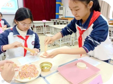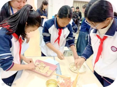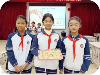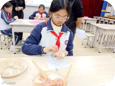 六年级的“饺子宴”充满了家的温暖。擀皮、放馅、捏边,动作一气呵成。一个个胖嘟嘟的饺子,包裹着劳动的香甜,更凝聚着团队协作的快乐。