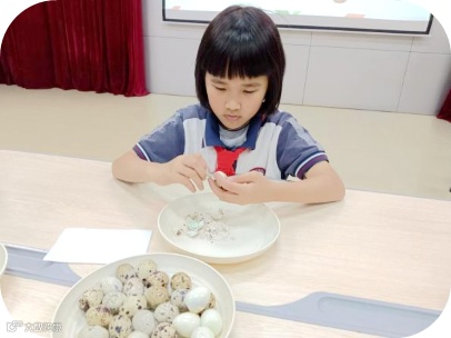 圆润的鹌鹑蛋成了考验技巧的“考题”。小选手们屏息凝神,指尖轻巧动作,力求蛋壳剥得快、蛋身保完整,个个争当快手小当家。