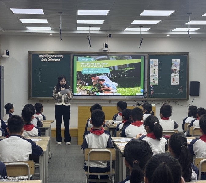 姚素怡老师与四(5)班学生共同呈现了四年级上册 Unit4《Helping in the community》B 部分 Read & Write 读写课例。课堂以多层级任务为牵引,串联观察、预测、讨论、分析、创编等进阶式思维活动,将阅读技巧自然融入各教学环节。通过 “Read and think” 活动深化育人价值,最终以“Look, choose and say”及“Write a report”完成写作输出—学生依托教师搭建的 “英语写作汉堡结构”(Introduction-Facts&Details-Conclusion)高效创写,展现了扎实的语言运用能力。整堂课氛围积极愉悦,教学环节条理清晰,兼具趣味性与实效性,深受学生喜爱。