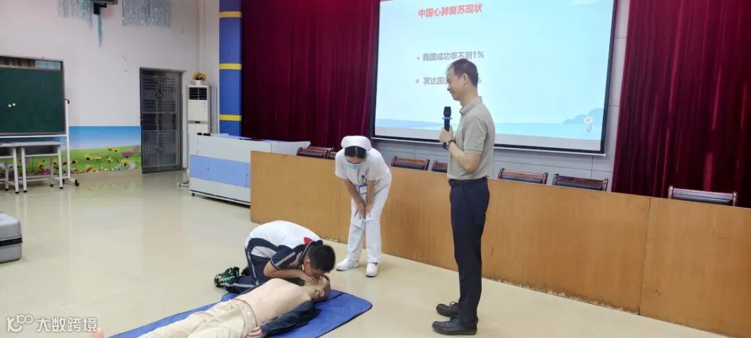 李群华医生采用理论知识讲授与现场演示相结合的形式,用由浅入深、通俗易懂的言语为学生们详细讲解徒手心肺复苏流程、创伤的院前急救、止血的应急处理等一系列急救知识和技能。学生们踊跃回答问题,现场学习气氛很浓烈。