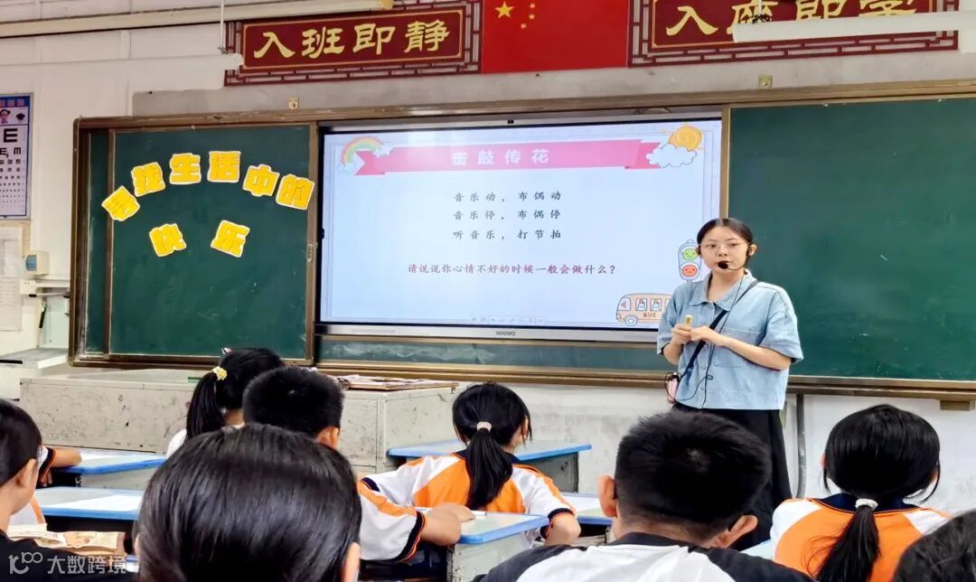 杨婷婷老师为五年级学生带来一场别开生面的心理健康之旅。随着轻快鼓点,“击鼓传花”游戏迅速点燃氛围,学生们耳听节奏、手打节拍、眼随玩偶,多感官联动,在欢声笑语中叩响快乐感知的大门。