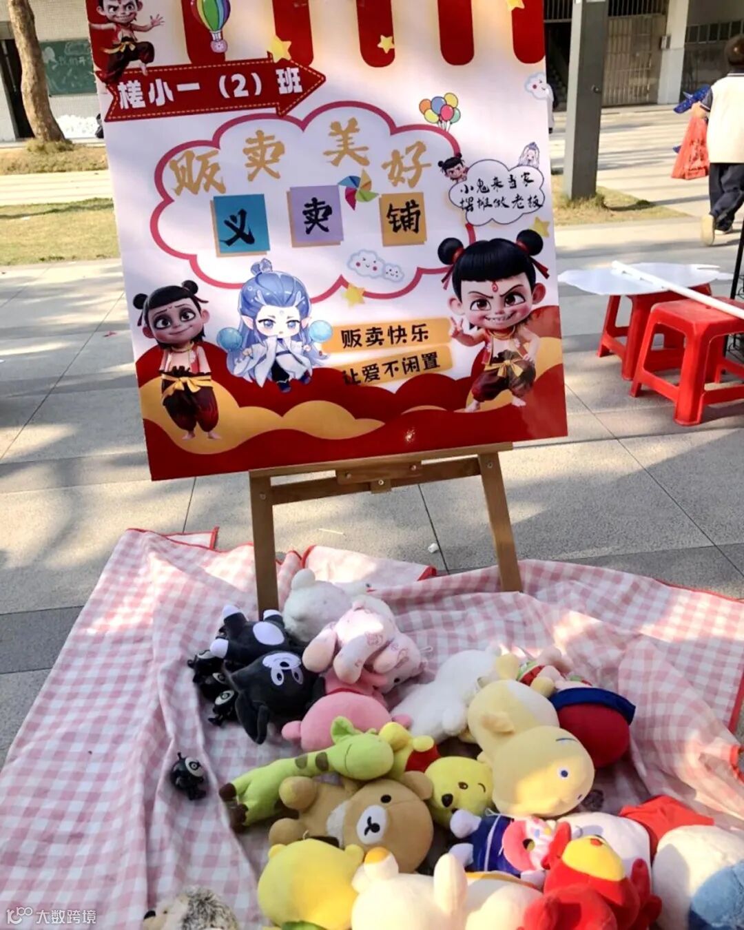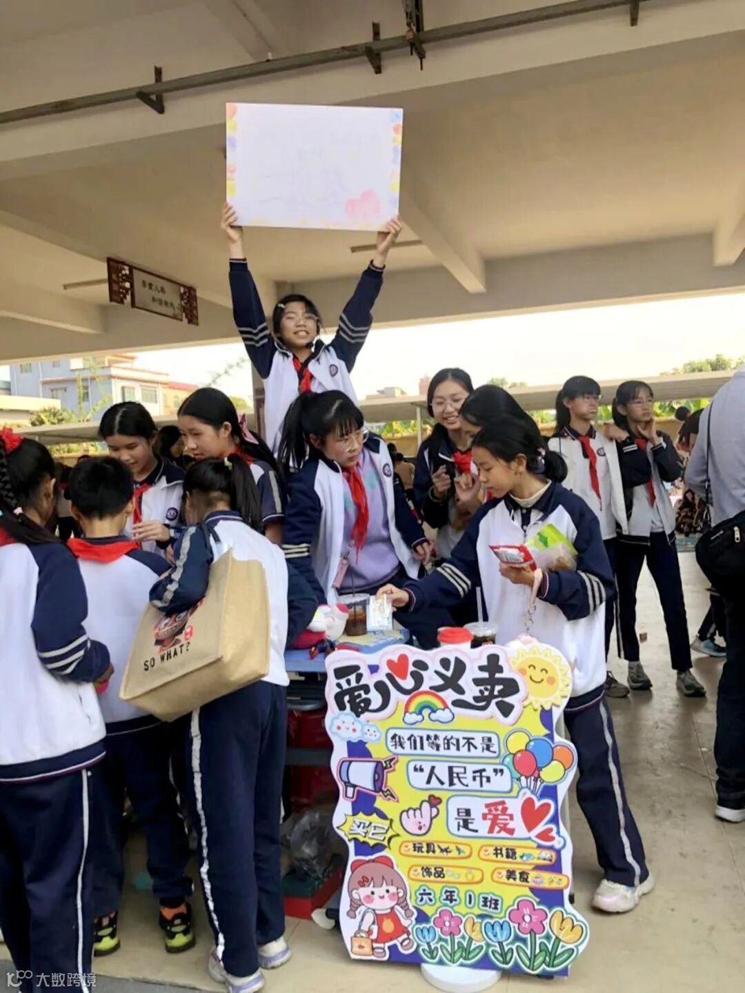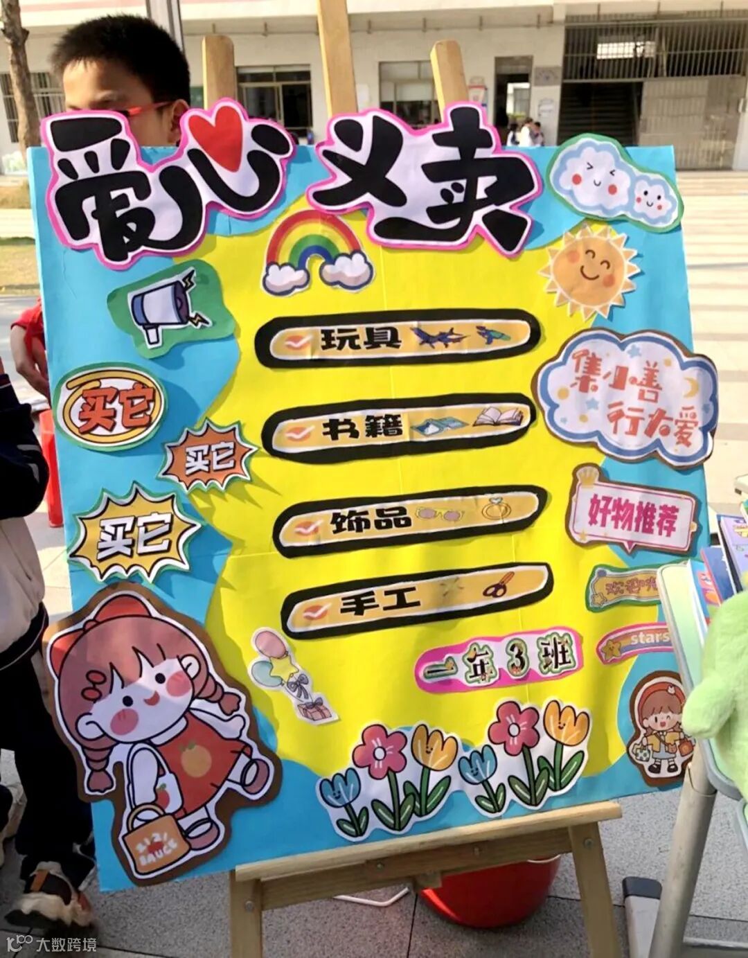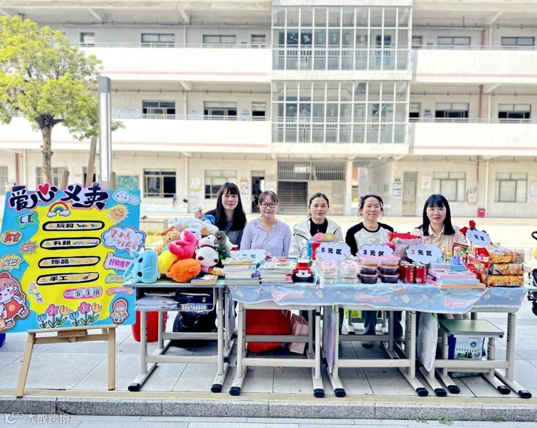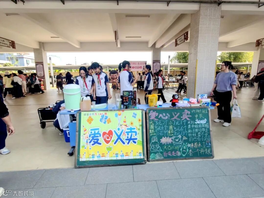 下午两点半,家长代表和同学们马不停蹄地开始布置场地。转眼间,空旷的校道便热闹起来:各个班级的商铺整齐排列,别出心裁的宣传海报、琳琅满目的义卖商品一字排开,整个校园充满了欢声笑语。