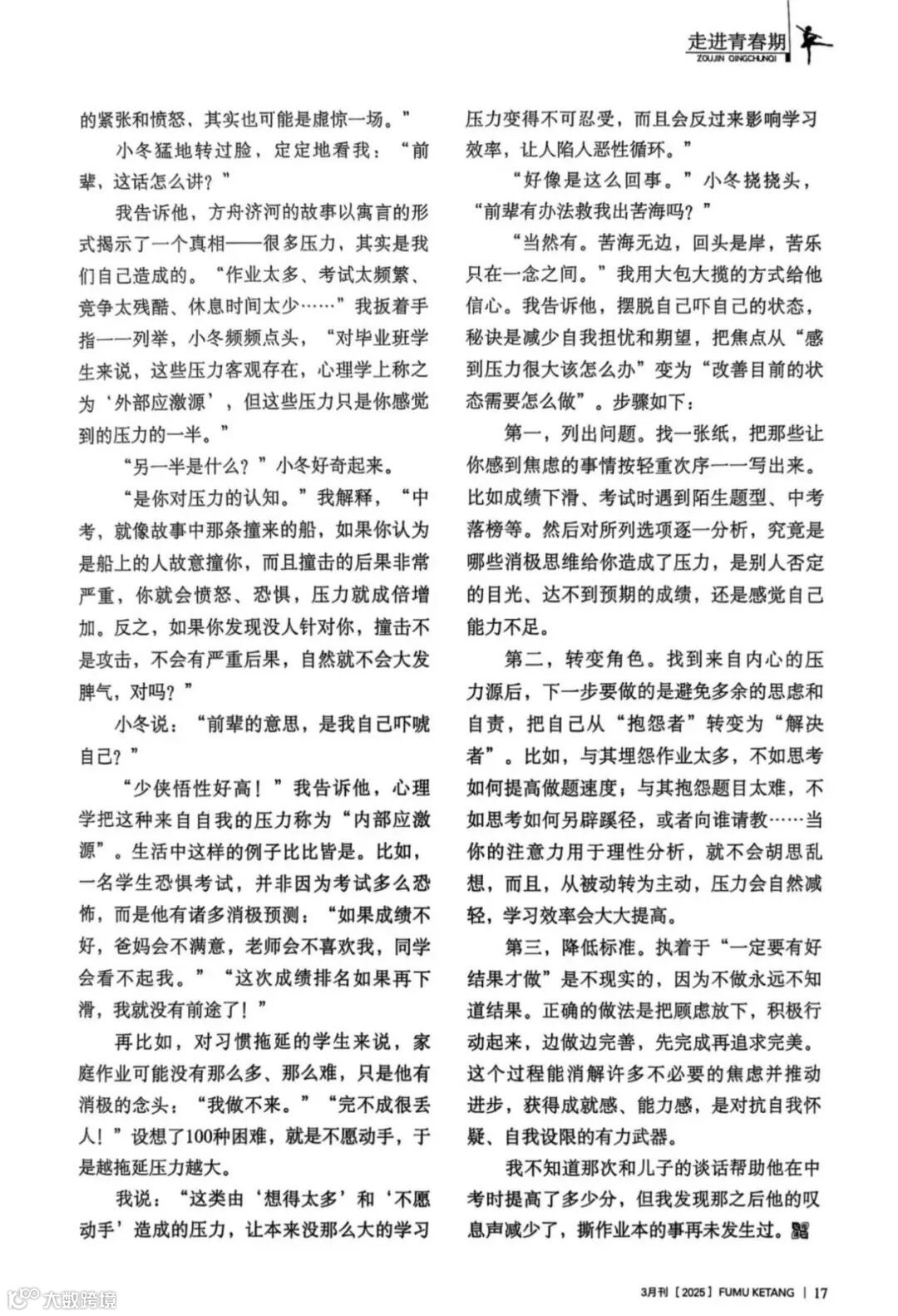 文章围绕初三学生小冬面临的中考压力展开,真实反映了青春期孩子在学业负担下的焦虑、愤怒等情绪,直击家长与孩子的共同痛点,具有强烈的现实意义。通过小冬“大声叹气”“撕作业本”等细节,以及父子间“少侠”“前辈”的幽默互动,生动刻画了青春期孩子的心理状态,让读者(尤其是家长和学生)感同身受。作者引用《庄子》“方舟济河”的故事,结合“外部应激源”和“内部应激源”的心理学概念,形象地解释了压力来源,既有趣味性又有启发性,帮助读者理解情绪背后的逻辑。