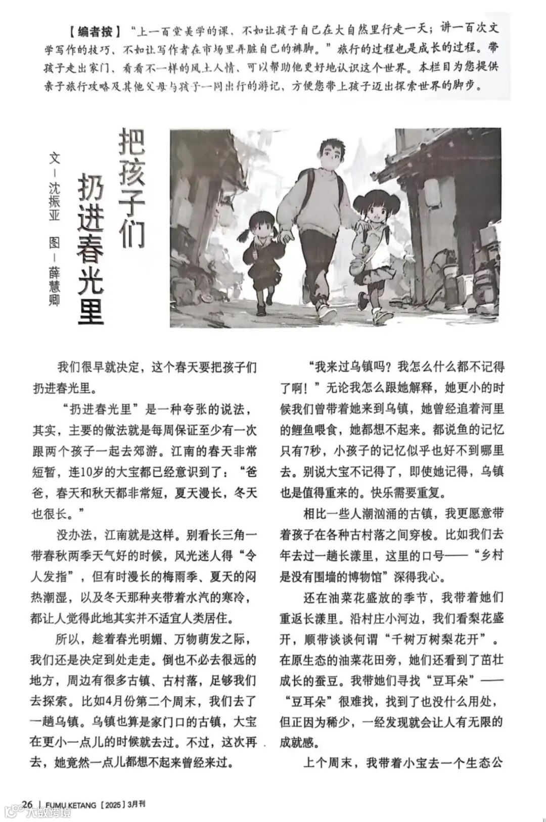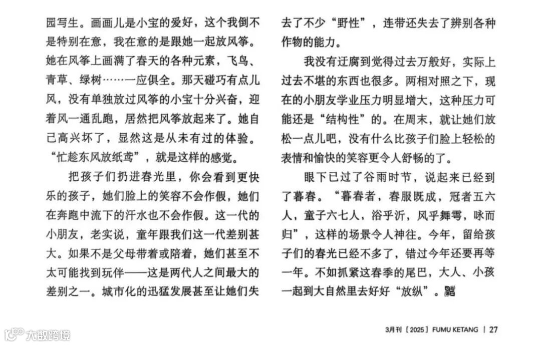 文章生动描绘了现代家庭在快节奏生活中如何通过亲近自然来缓解压力,尤其适合关注亲子关系与孩子成长的父母。以“把孩子们扔进春光里”为核心意象,语言优美,充满画面感,激发读者对自然与童年的向往。不仅提供亲子户外活动的具体建议(如郊游、写生、探索古村落),还融入对教育、城市化、童年记忆的深刻思考。紧扣春日短暂的特点,鼓励读者珍惜当下,带孩子走进自然,具有强烈的时效性和实践指导意义。