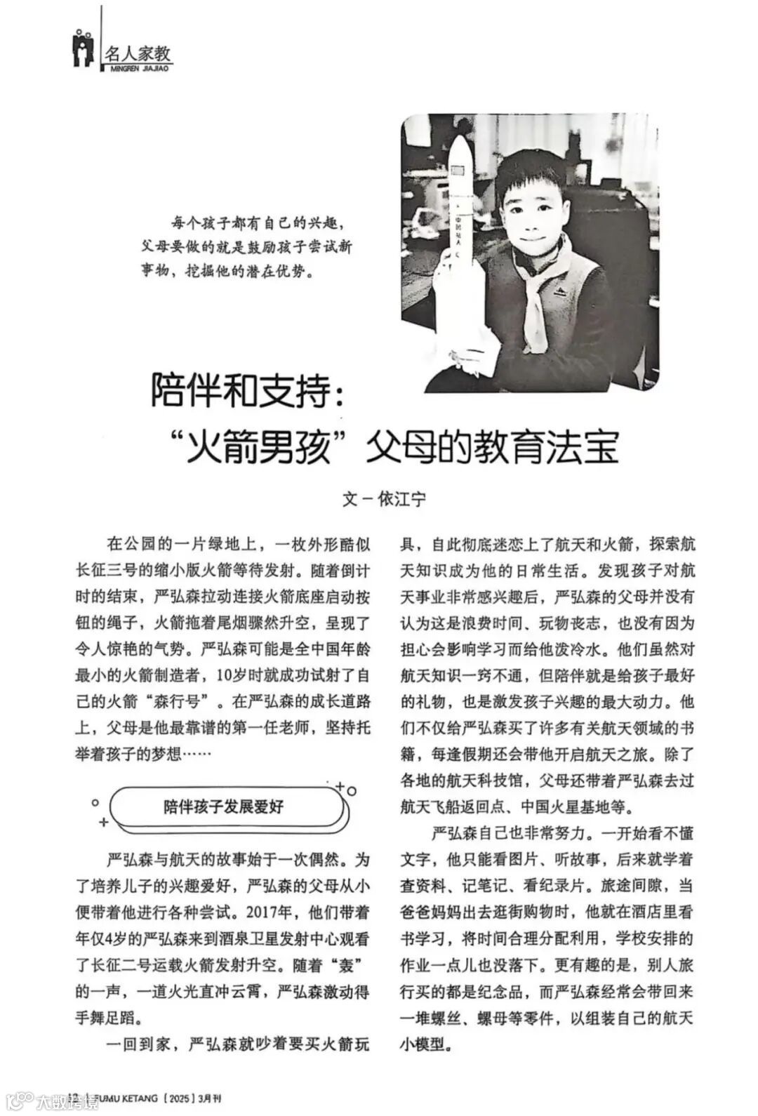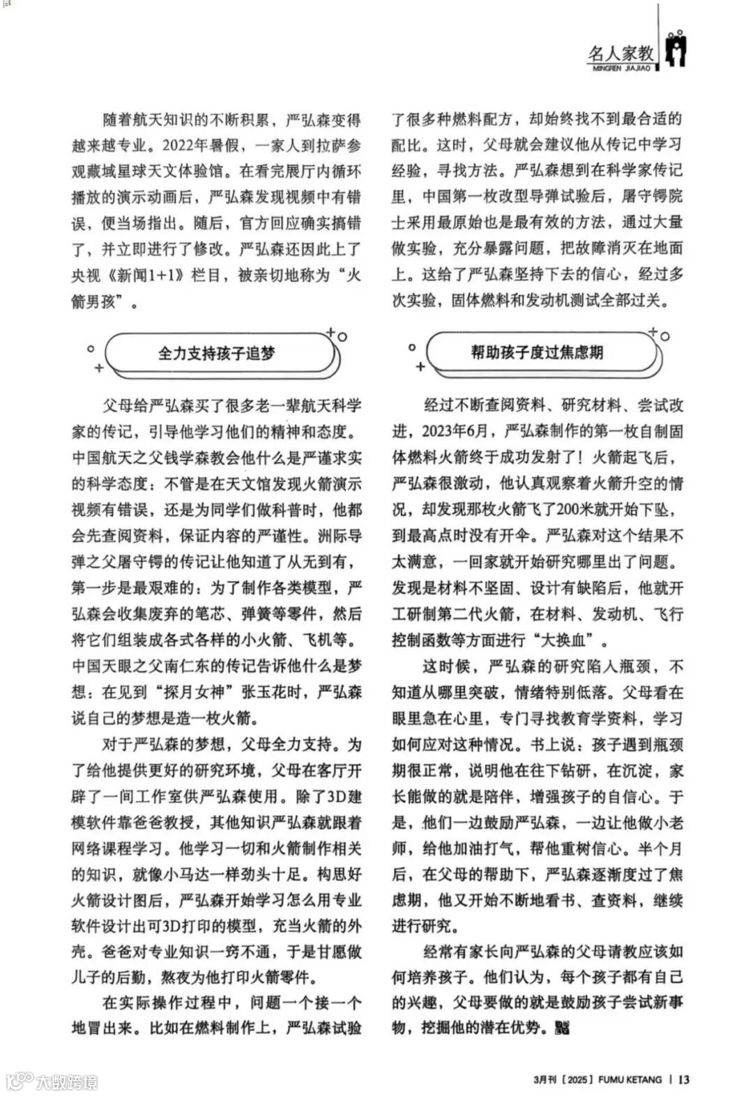 严弘森,10岁时成功试射自制火箭“森行号”,被誉为“中国最小火箭制造者”。他的航天梦想始于4岁时观看火箭发射的震撼经历,父母敏锐捕捉到他的兴趣,并通过书籍、旅行、实验材料等持续支持。他们鼓励他自主学习航天知识,引导他阅读科学家传记,培养严谨的科学态度和解决问题的能力。在火箭研发过程中,严弘森经历了失败和瓶颈期,父母以陪伴和鼓励帮助他度过焦虑,最终实现突破。