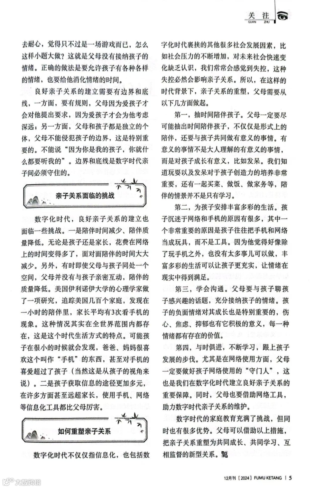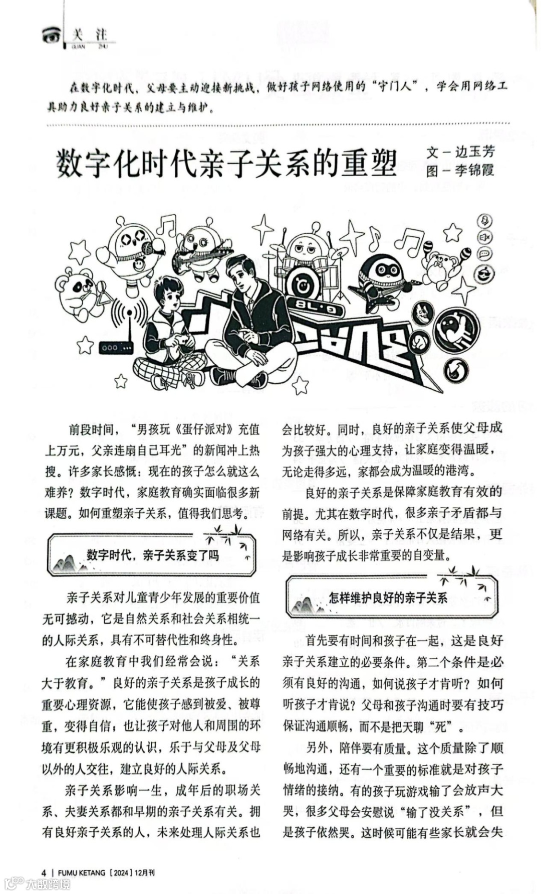 文章指出,在数字化时代,家庭教育面临很多新课题,亲子关系也面临新的挑战,特别是与网络有关的亲子矛盾日益增多。因此,父母需要主动迎接这些挑战,做好孩子网络使用的“守门人”,并学会利用网络工具来助力良好亲子关系的建立与维护。