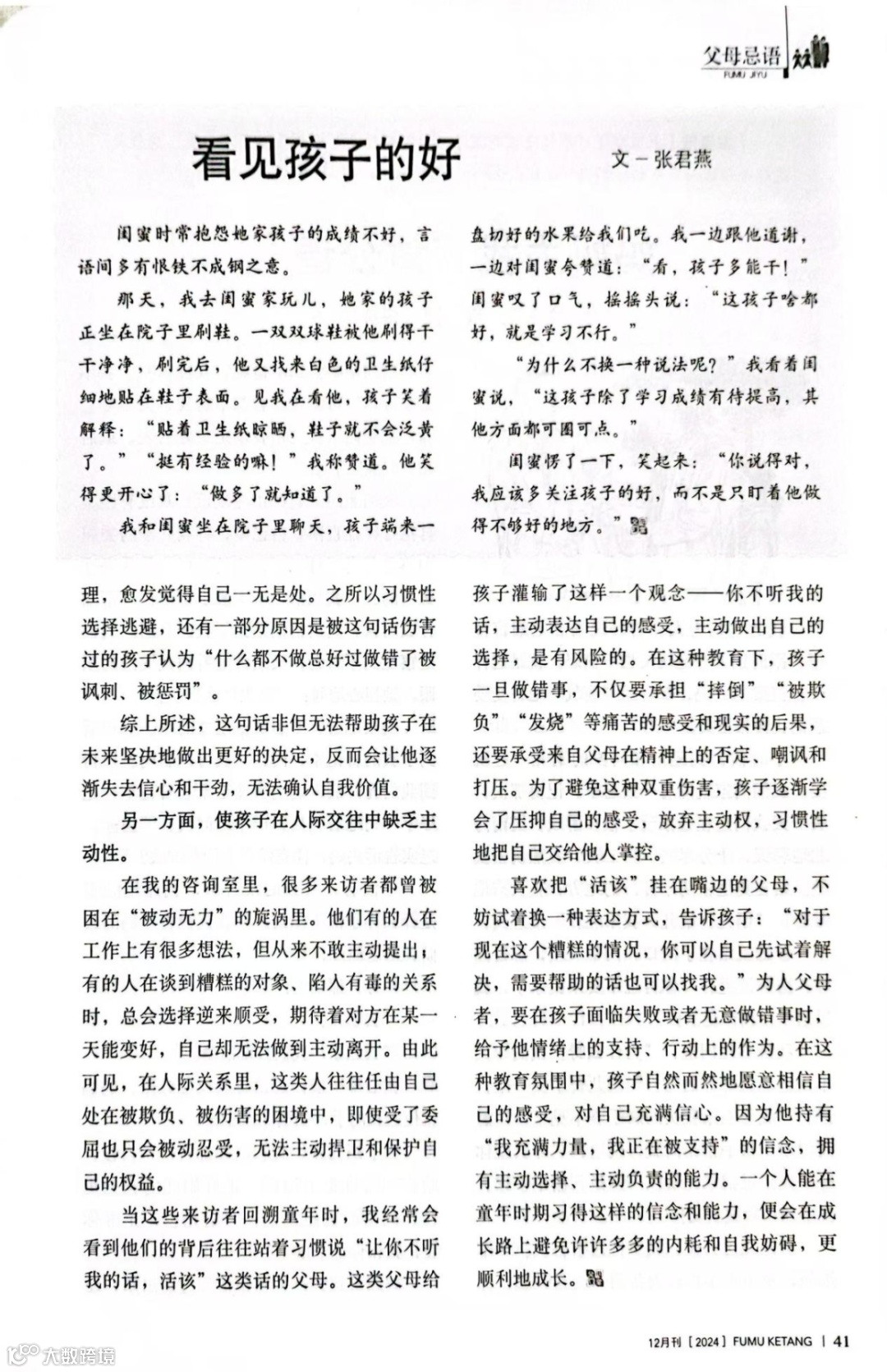 这次给大家推荐《父母课堂(2024年12月刊)》中的五篇文章,本期导读提纲由陈敏老师撰写,为您自主阅读和使用该刊提供合适的指导方向,欢迎各位家长积极阅读。