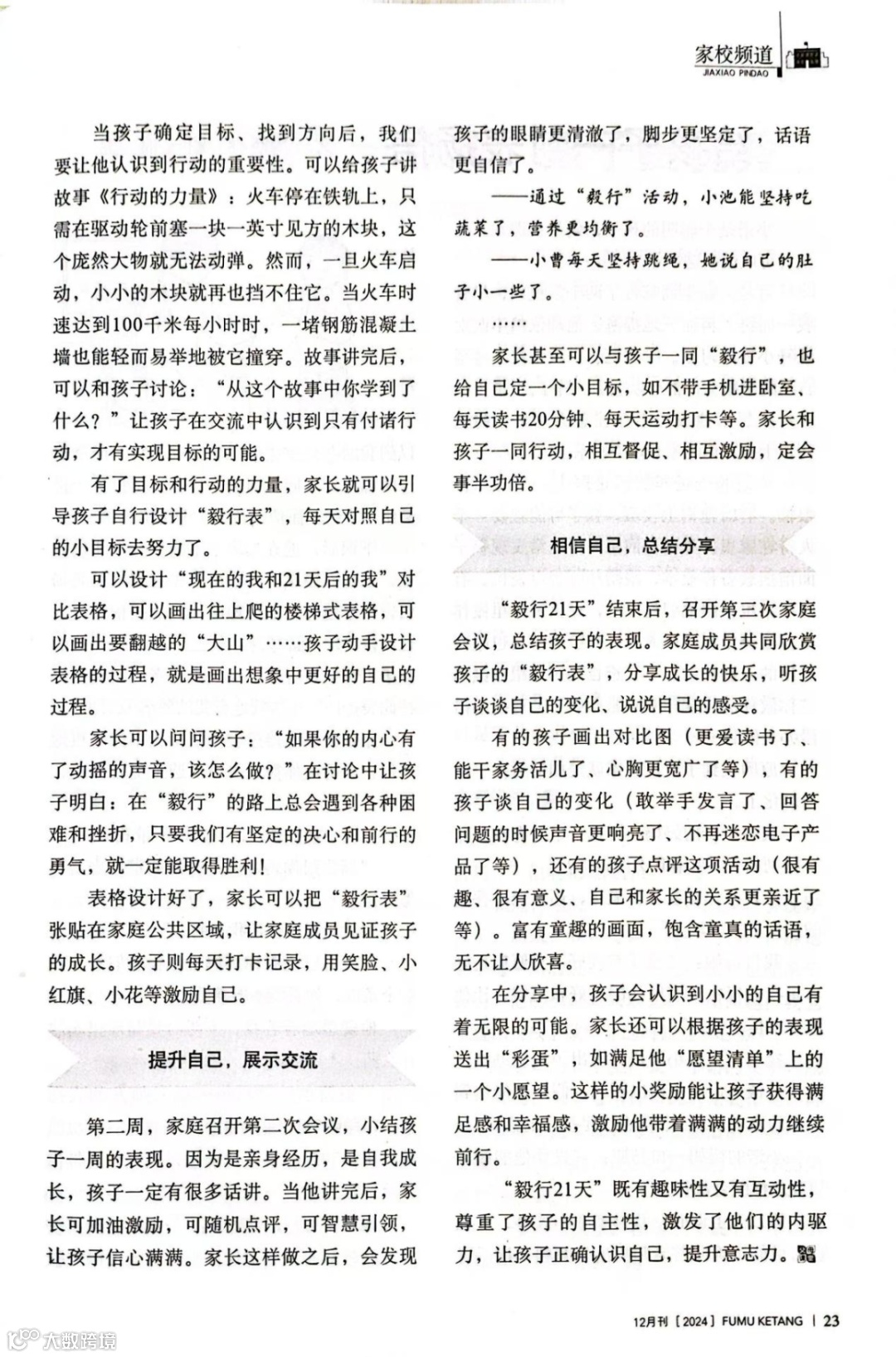 这是一篇关于习惯养成和自我提升的重要文章,通过“毅行21天”这样既有趣味性又有互动性的实践活动,既激发了孩子的内驱力,让孩子正确认识自己,又培养了孩子良好的行为习惯、提升心理品质、实现自我成长。