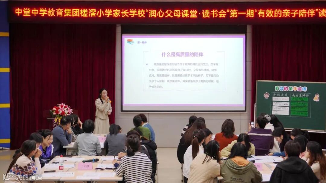 中堂镇家长学校讲师团成员殷雅婷老师给家长们带来精彩课程《有效的亲子陪伴》。殷老师精心设计的趣味破冰游戏“大西瓜和小西瓜”,瞬间点燃了现场气氛,家长们在开心愉悦的氛围中开展读书沙龙活动。