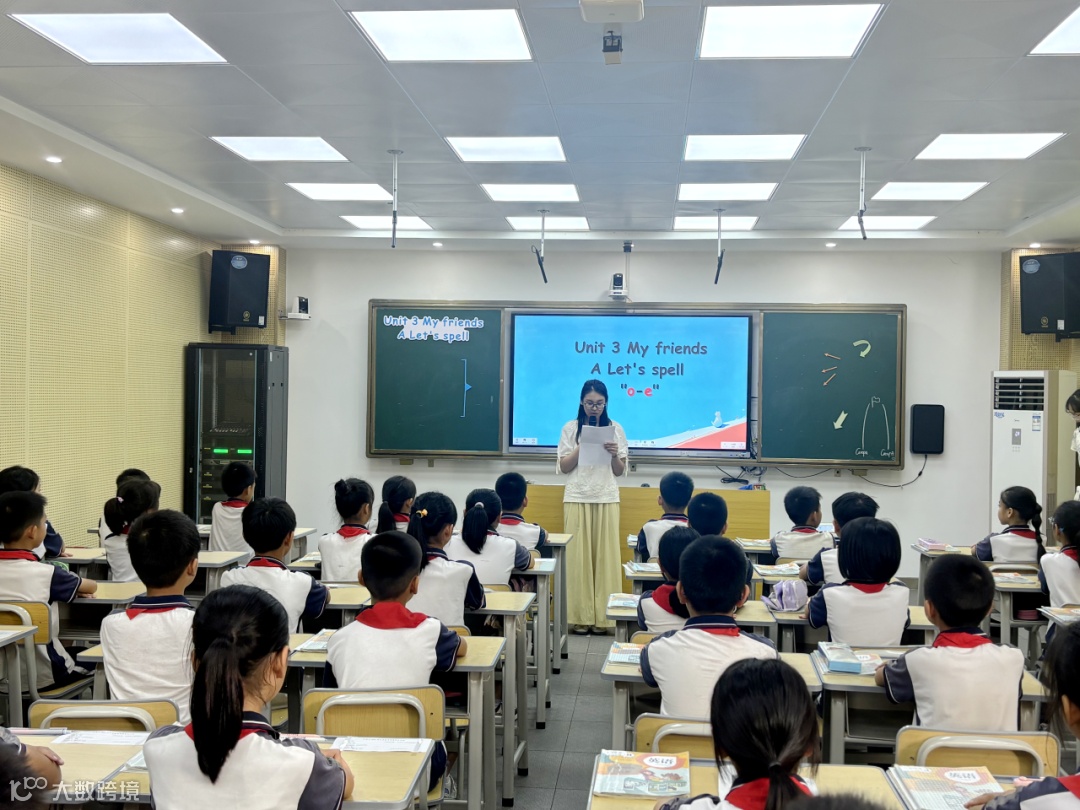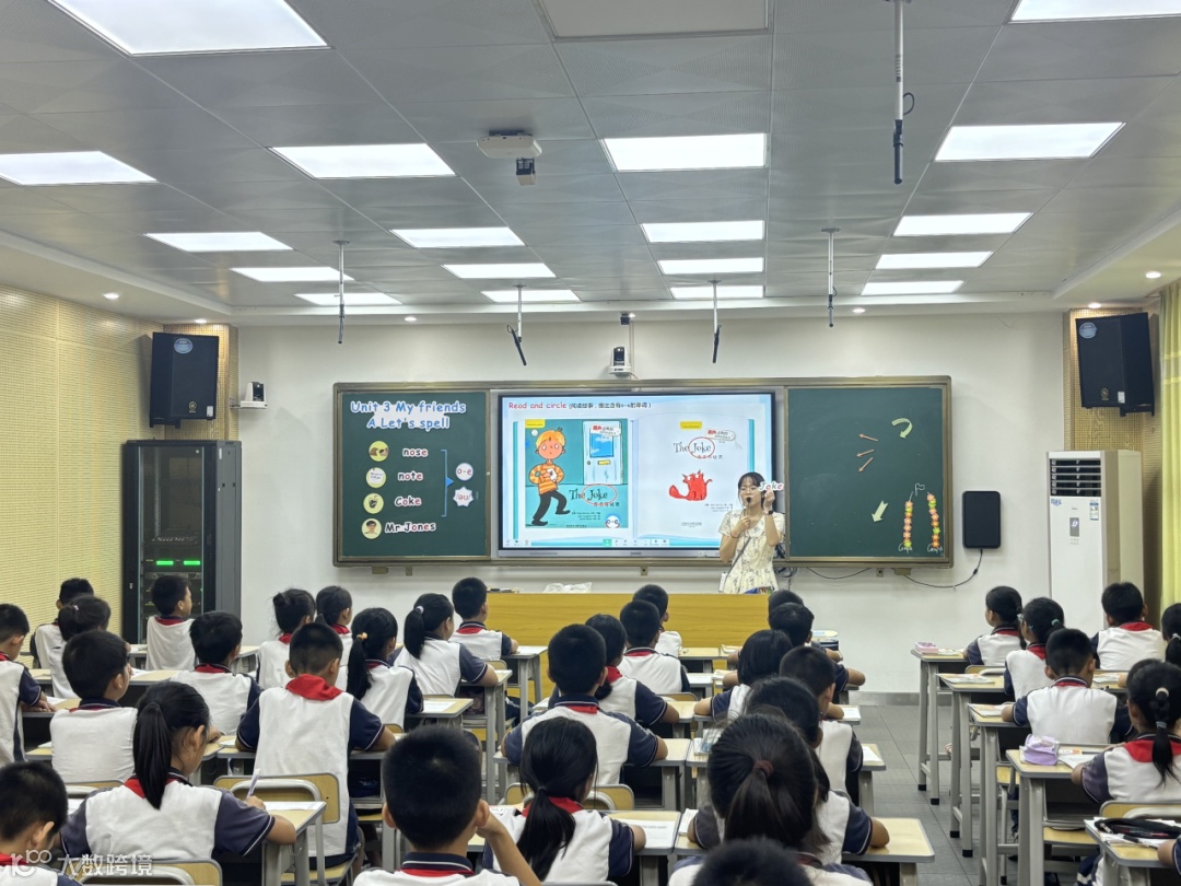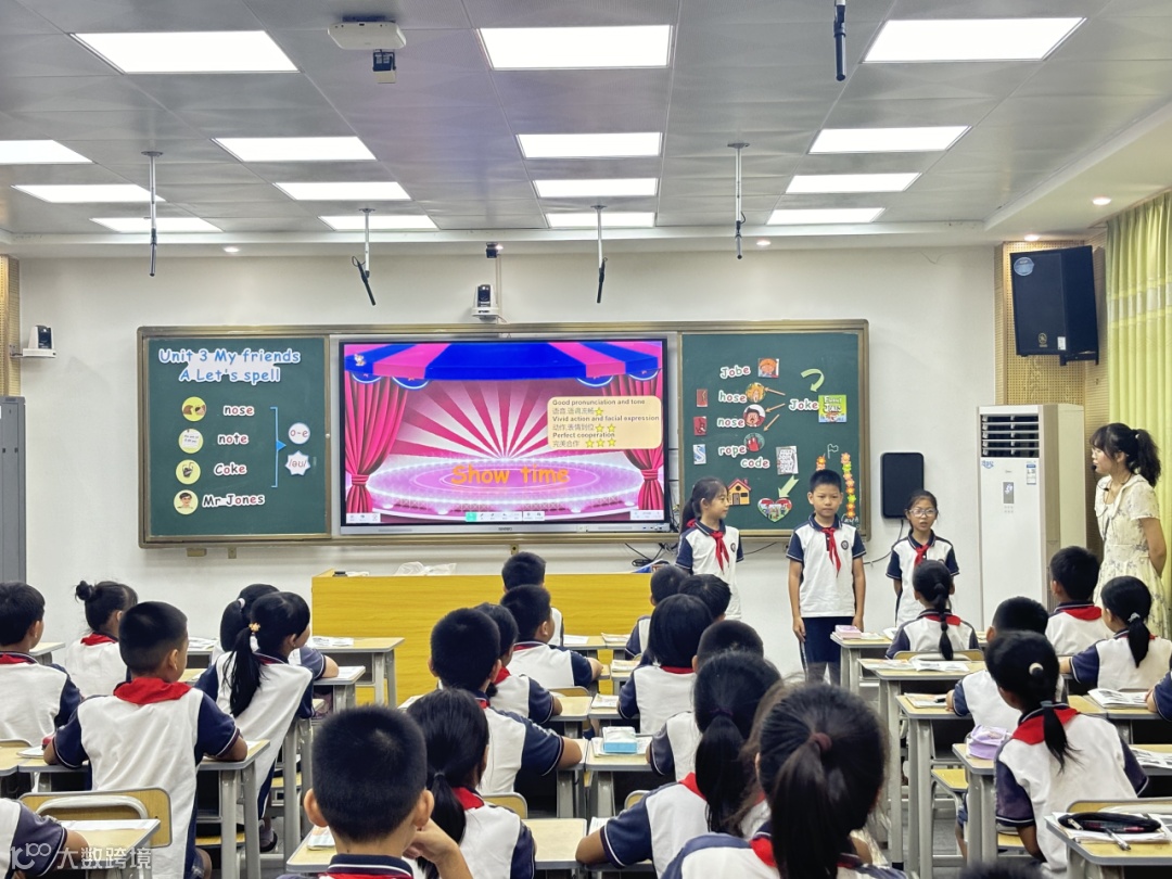 会议伊始,课题组成员李婉蓉老师与四(3)班的孩子们带来了一节课题实验汇报课《Let’s spell o-e》。李老师展示了中年级运用phonics融合虚构类绘本的语音教学模式。学生从朗朗上口的韵律歌中探索发现字母组合发音规律,老师通过一系列丰富有趣的拼读活动巩固学生的正确发音,培养学生的自主拼读能力,并且巧妙运用包含字母组合o-e的绘本,认读习得固定的单词,最后将绘本故事融合戏剧元素,生动有趣地表演出来。戏剧教学融入语音课堂,激发学生的学习积极性和创造力,提高学生参与课堂和合作学习的积极性,增强学生的表达自信。课堂上,学生学得饶有趣味,取得事半功倍的教学效果。