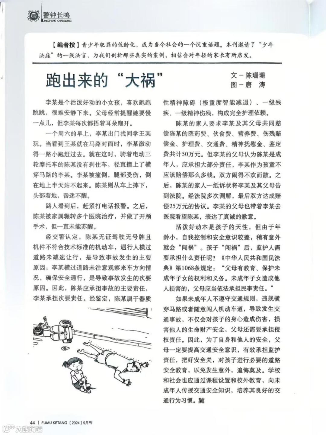 如果未成年人不遵守交通规则,违规横穿马路或者随意闯入机动车道,导致发生交通事故,不仅会对孩子的身心造成伤害,损害他人的生命财产安全,父母还需要承担侵权责任。通过学习了解“跑出来的大祸”一文,增强法律意识。