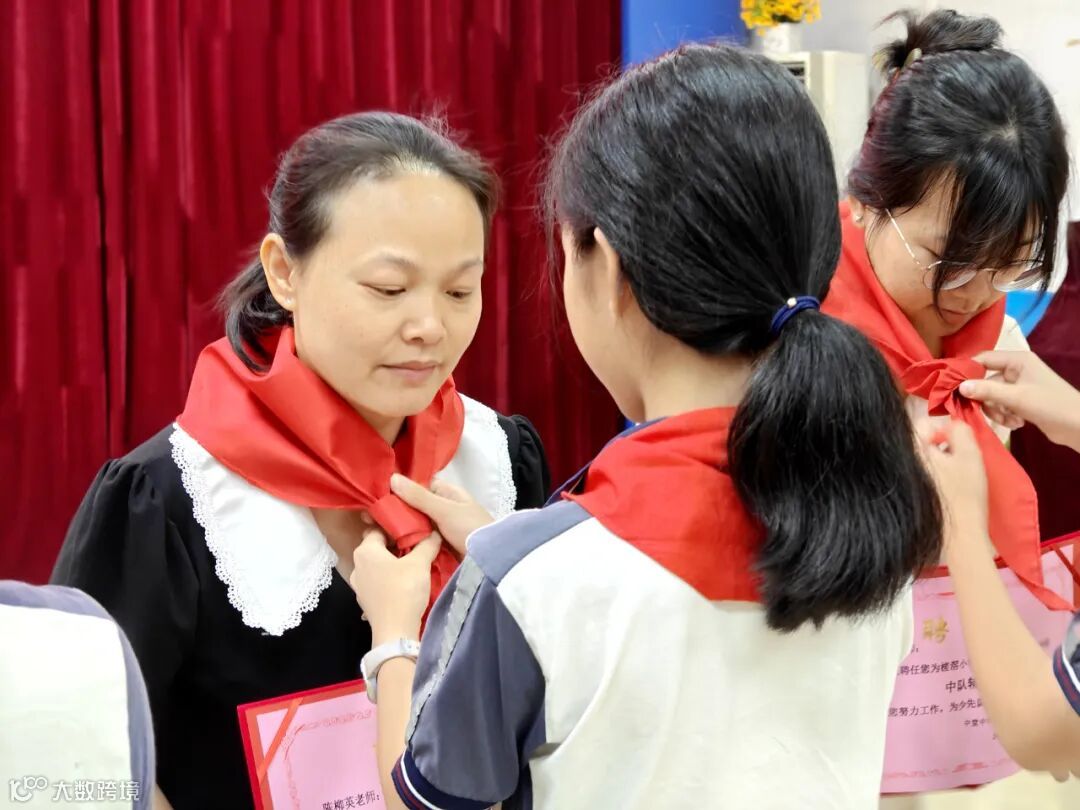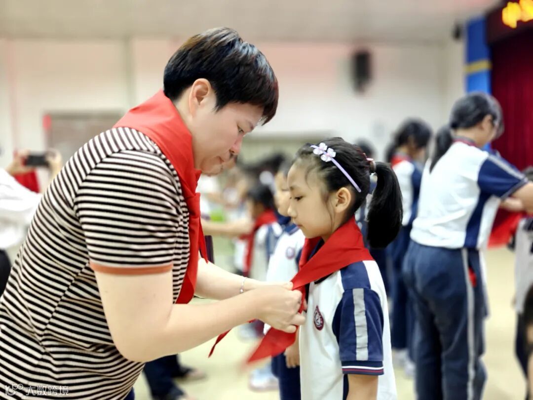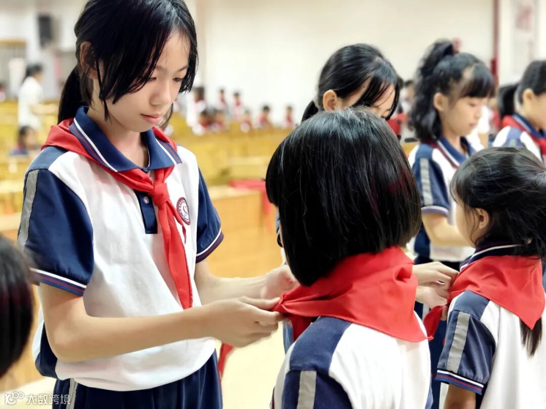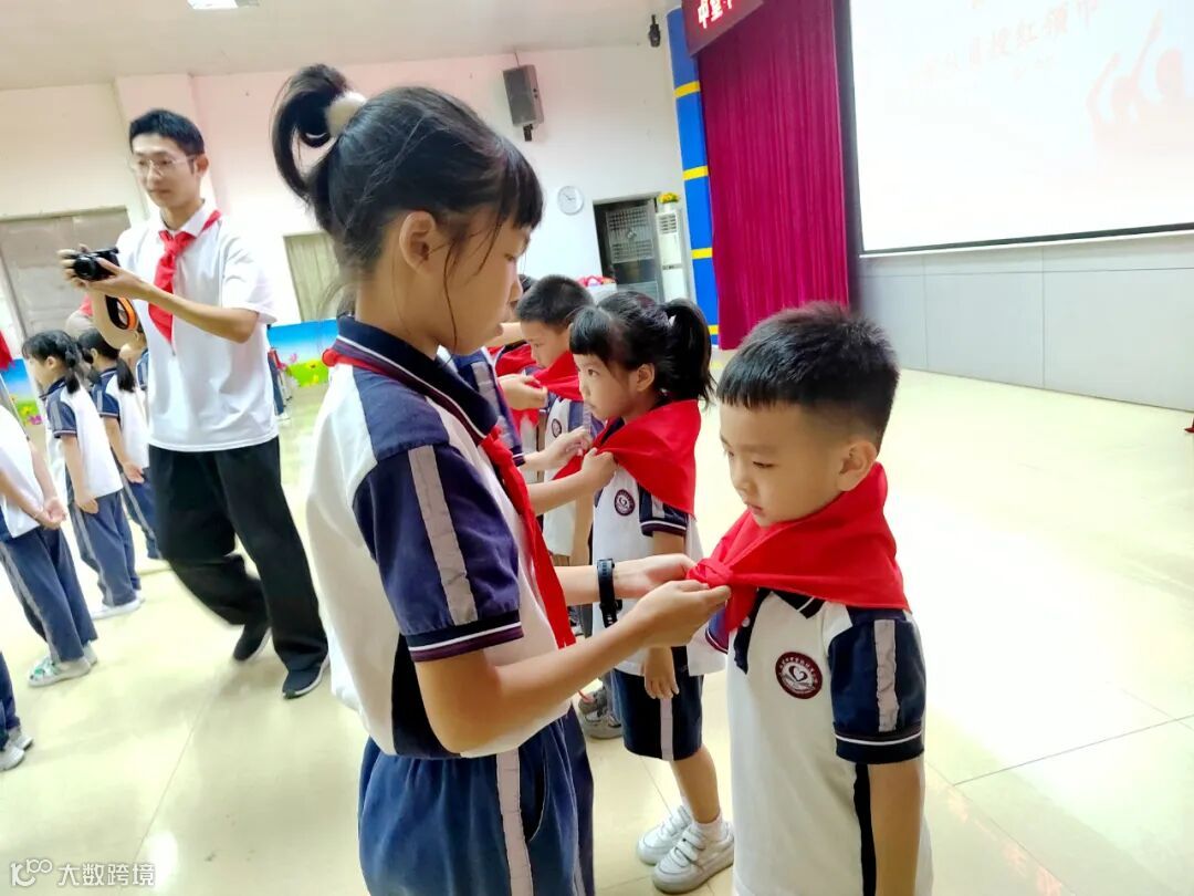 仪式进行第五项,学校少工委主任、少工委委员、团支部书记、大队辅导员和老队员代表为新队员佩戴红领巾。