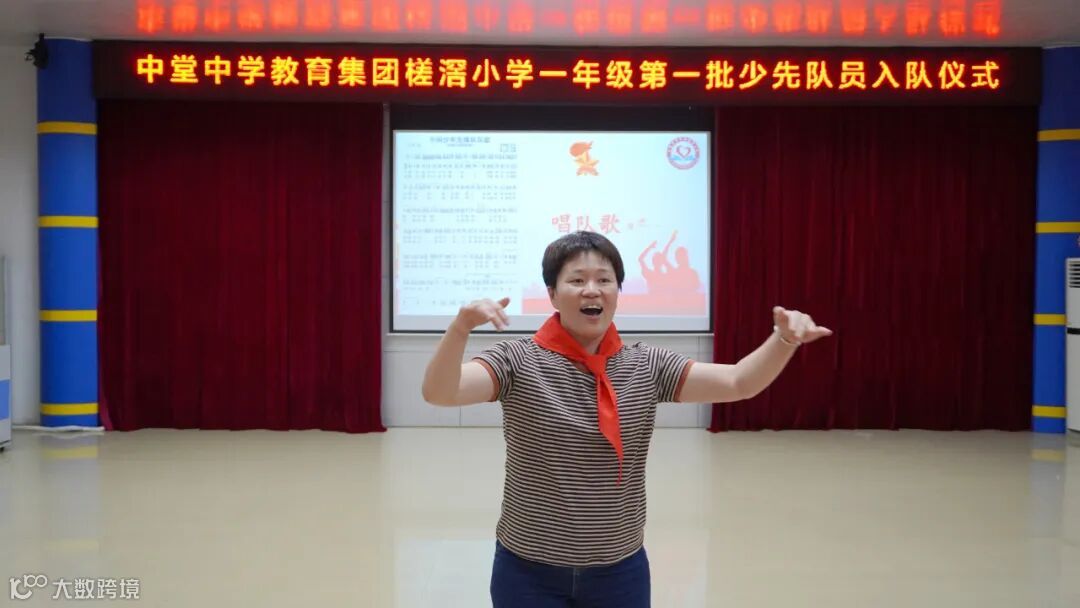 仪式进行第二项,学校少工委委员范小青带领新队员唱队歌。
