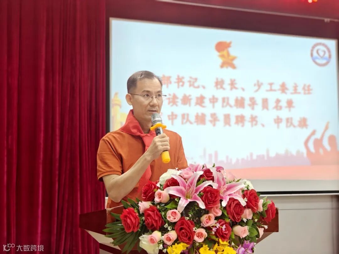 仪式进行第七项,学校党支部书记、少工委主任、校长杨金华宣读新建中队辅导员名单,并颁发中队辅导员聘书与中队旗。