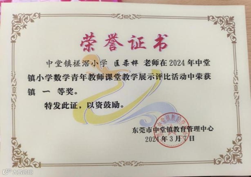 ▲匡柔桦老师在2024年中堂镇小学数学青年教师课堂教学展示评比活动中,荣获镇一等奖、东莞市片区二等奖
