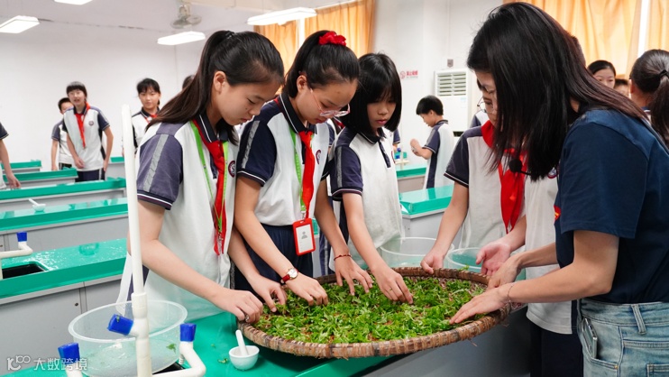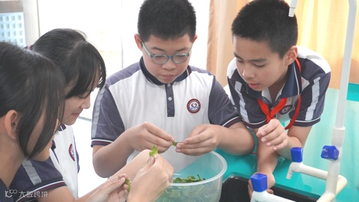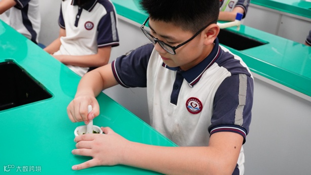 在老师的指导下,同学们按比例混合新鲜艾草叶和新鲜的薄荷叶,合作接力,细细研磨。