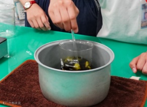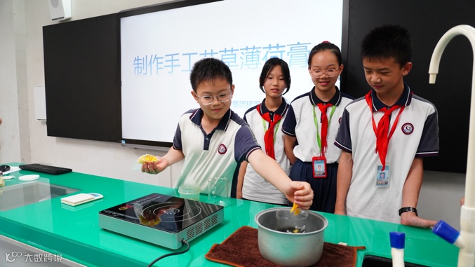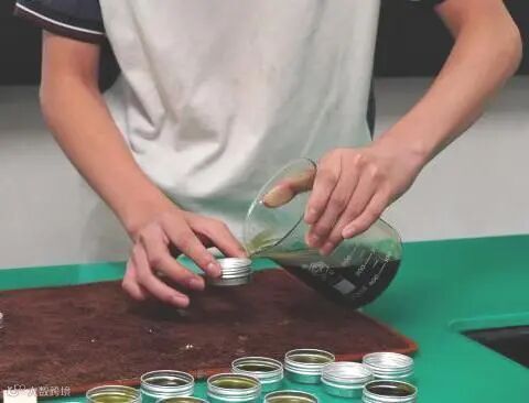 精油与蜂蜡按照4:1的比例进行配置,把蜂蜡放进精油里,利用电磁炉隔水加热,目的是加速蜂蜡的溶解,同学们在加热过程中必须不断进行搅拌,丝毫不敢马虎。