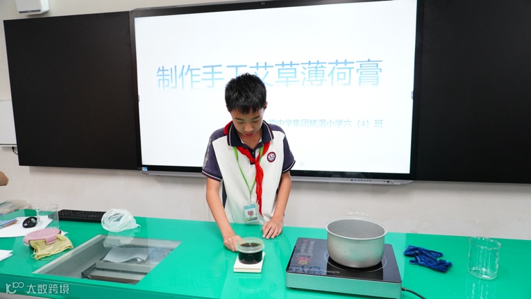 同学们使用电子秤称取同等质量的橄榄油,将橄榄油与粉碎的艾叶、薄荷叶混合一起。让橄榄精油与粉碎原料充分混合均匀,隔水高温蒸煮2小时。高温能够促进艾叶与薄荷叶的叶肉细胞有效物质溶解到橄榄精油中。