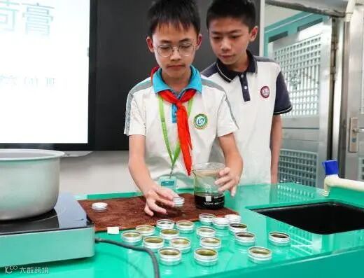 戴上手套,利用过滤网布滤出浓浓液汁,把液汁静置一天一夜,让精油和杂质分离,只取上面融合了艾叶和薄荷叶精华的精油。同学们按照步骤,认真制作。