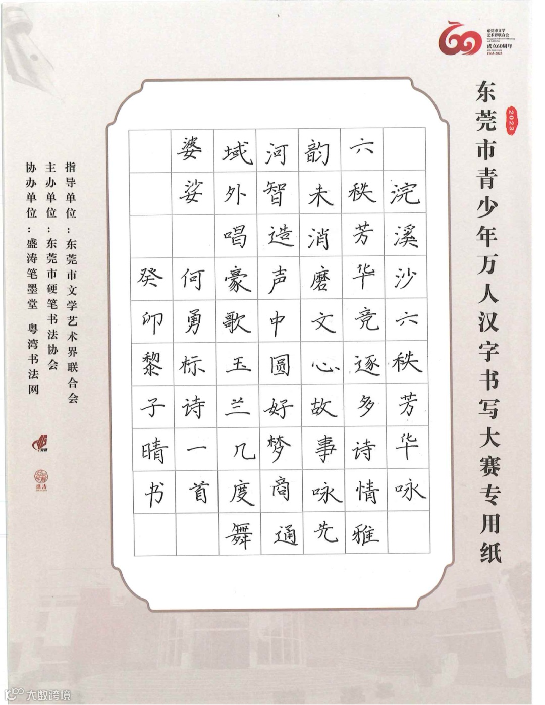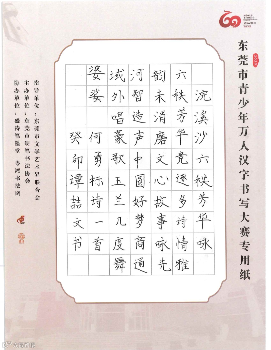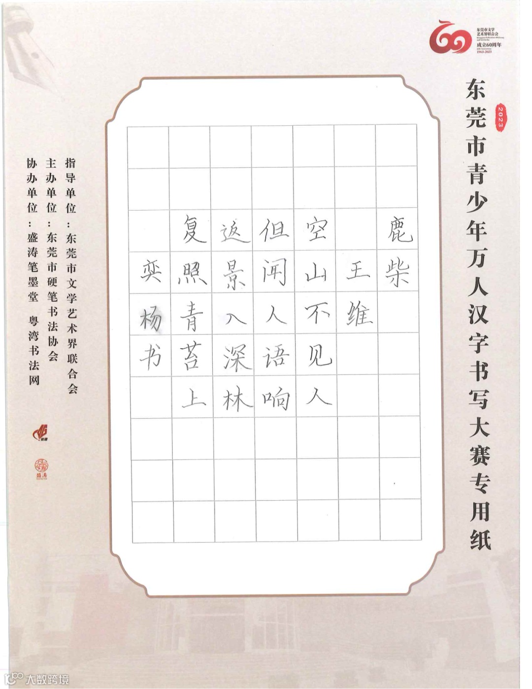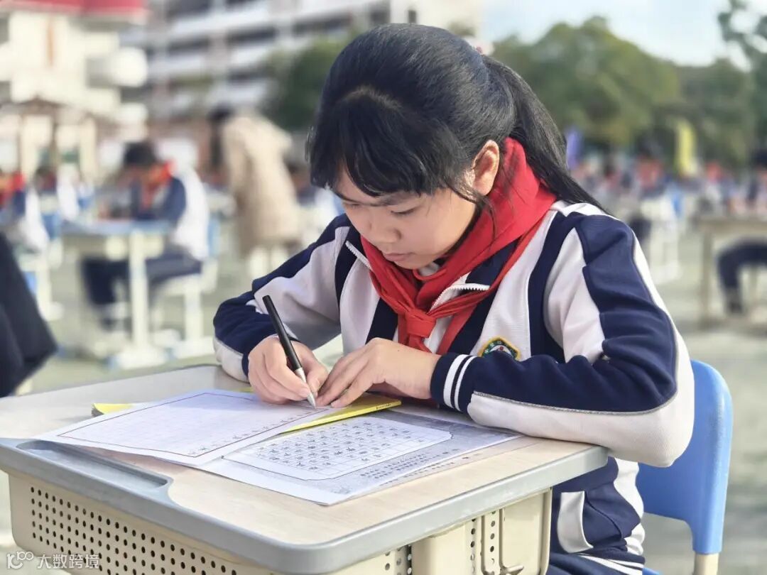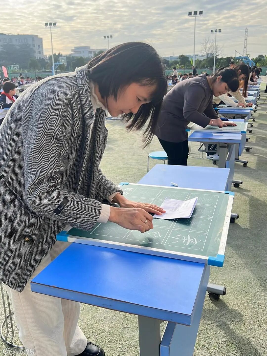悠扬的古琴音乐声在赛场缓缓流淌,不知不觉地把同学们带入了一个淡雅宁静的创作状态之中。同学们“双姿”规范,“头正、身直、臂开、足平”。书写时,一丝不苟,横竖撇捺,起笔收笔,尽显笔锋。