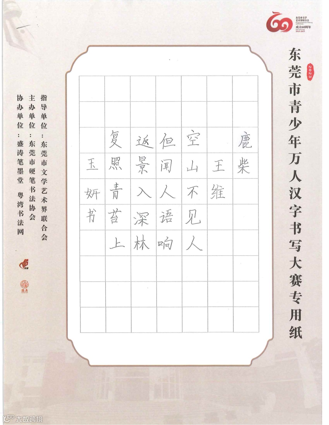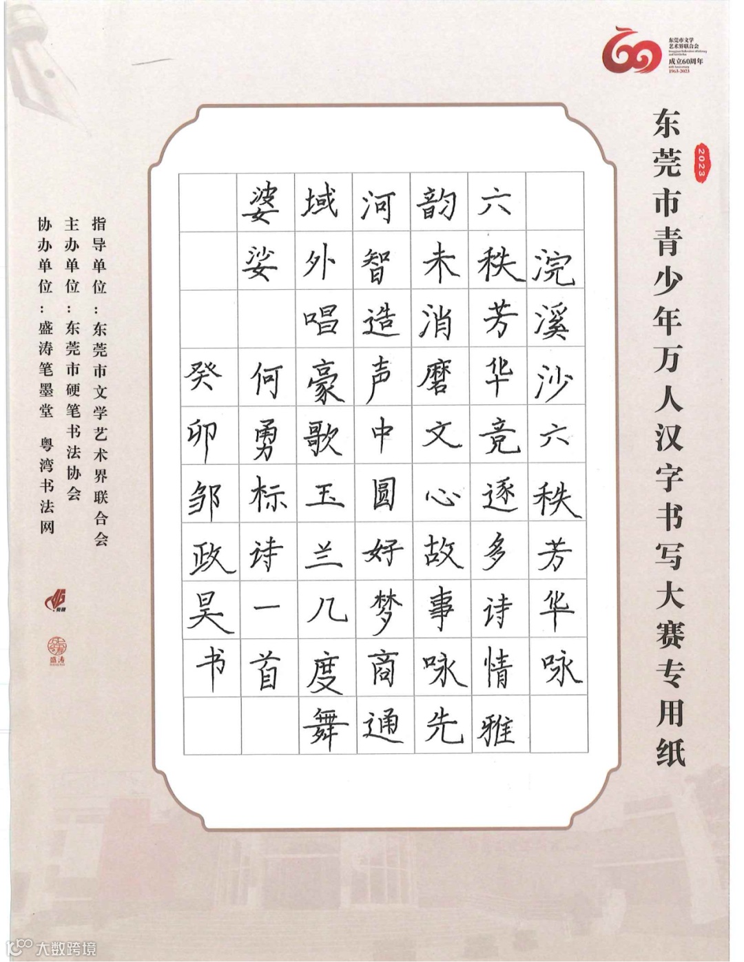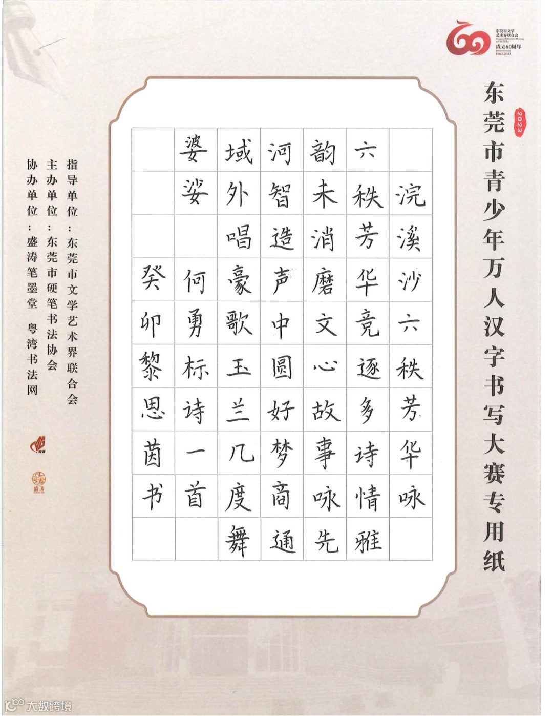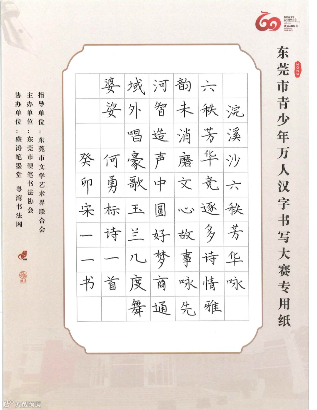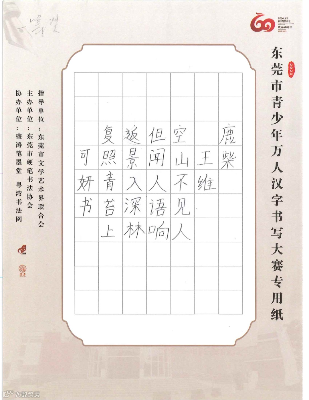 悠扬的古琴音乐声在赛场缓缓流淌,不知不觉地把同学们带入了一个淡雅宁静的创作状态之中。同学们“双姿”规范,“头正、身直、臂开、足平”。书写时,一丝不苟,横竖撇捺,起笔收笔,尽显笔锋。