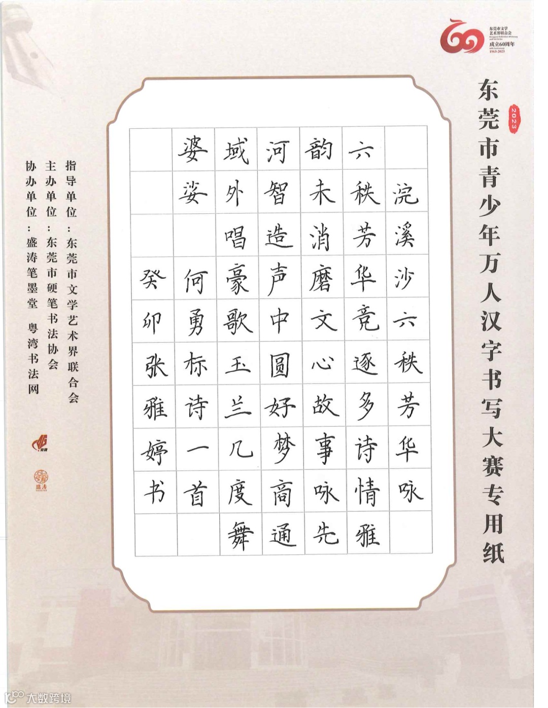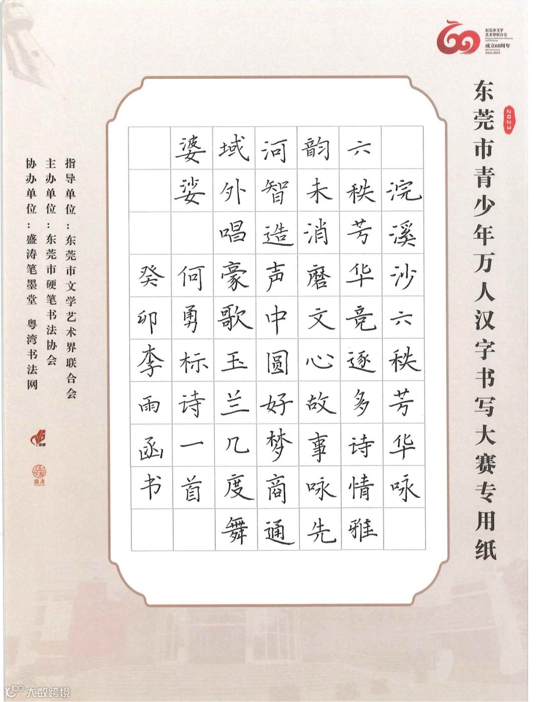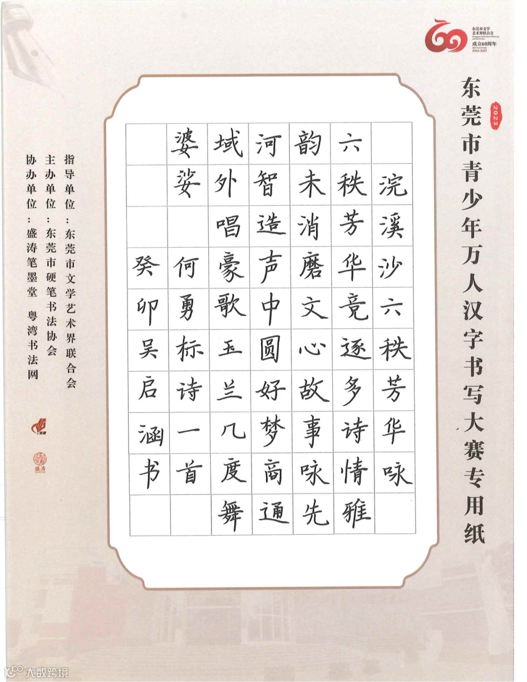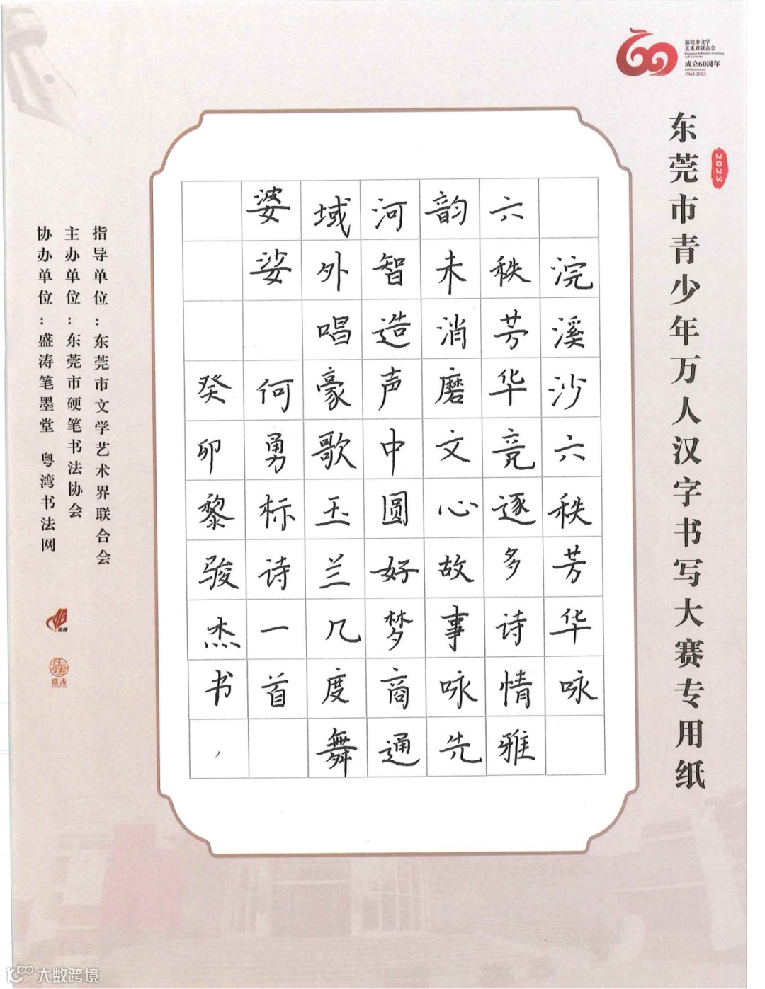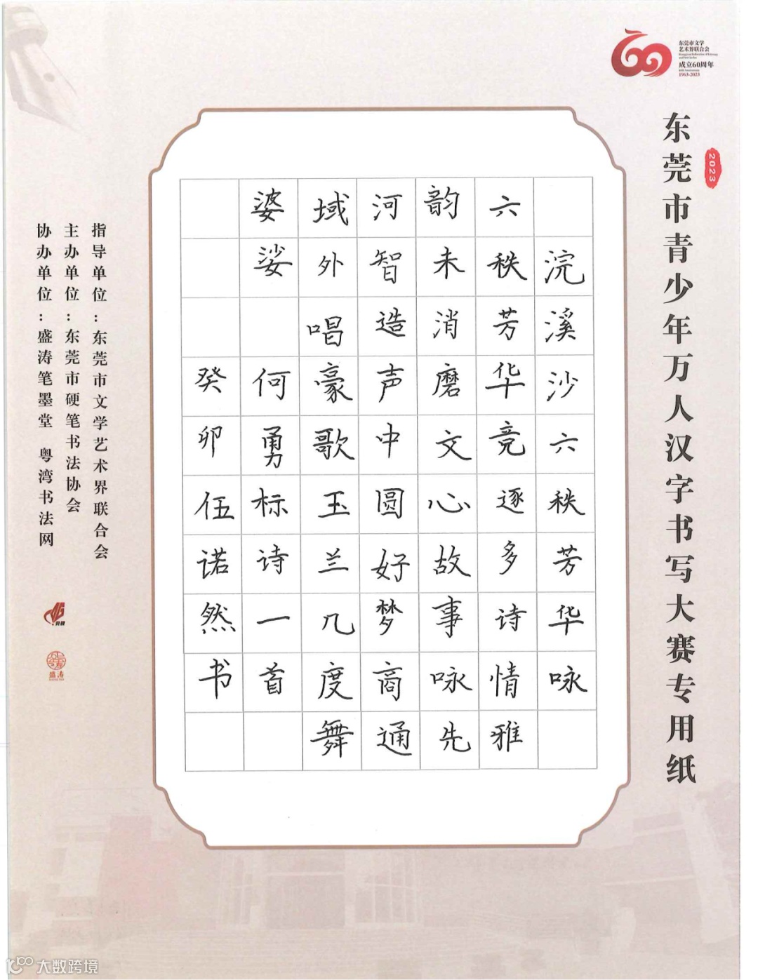 悠扬的古琴音乐声在赛场缓缓流淌,不知不觉地把同学们带入了一个淡雅宁静的创作状态之中。同学们“双姿”规范,“头正、身直、臂开、足平”。书写时,一丝不苟,横竖撇捺,起笔收笔,尽显笔锋。