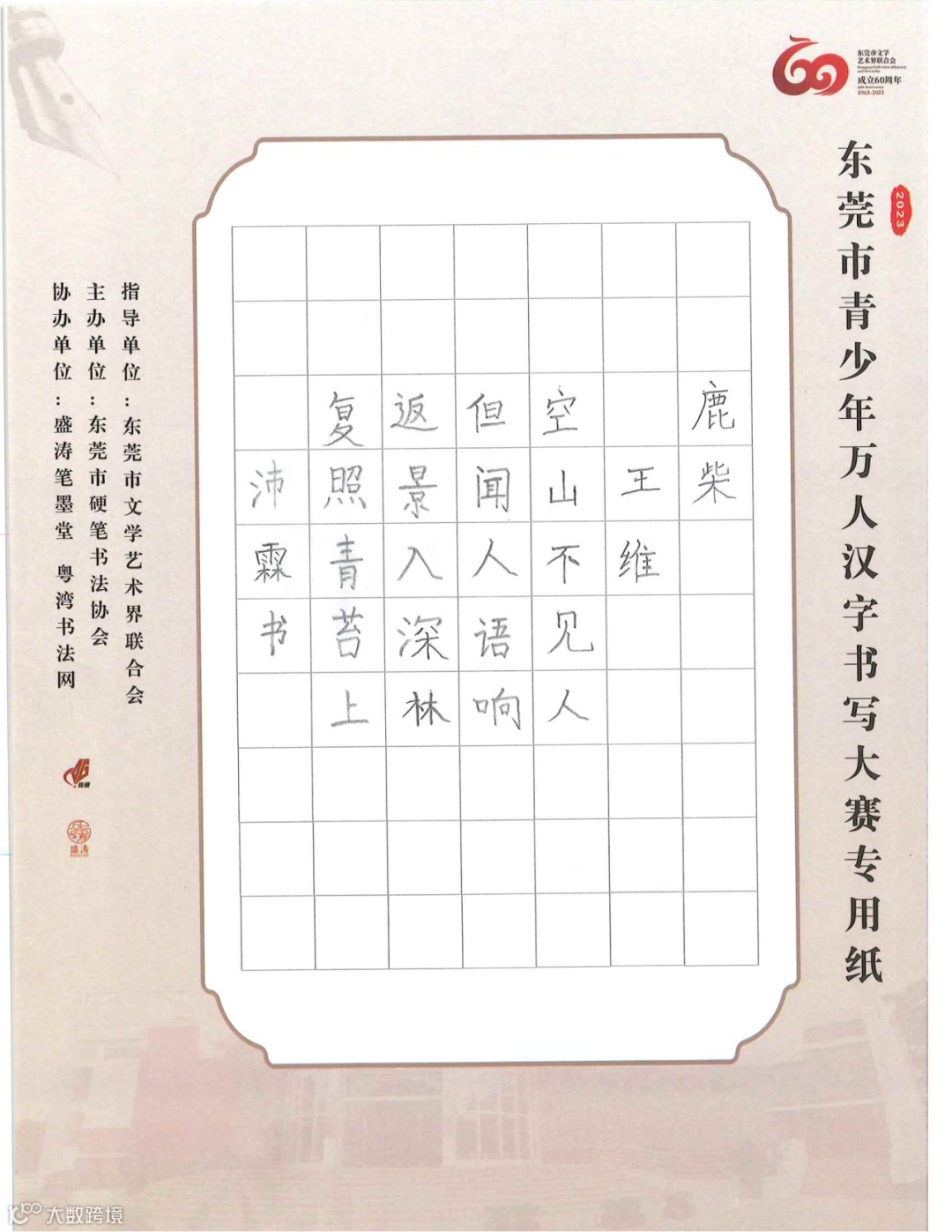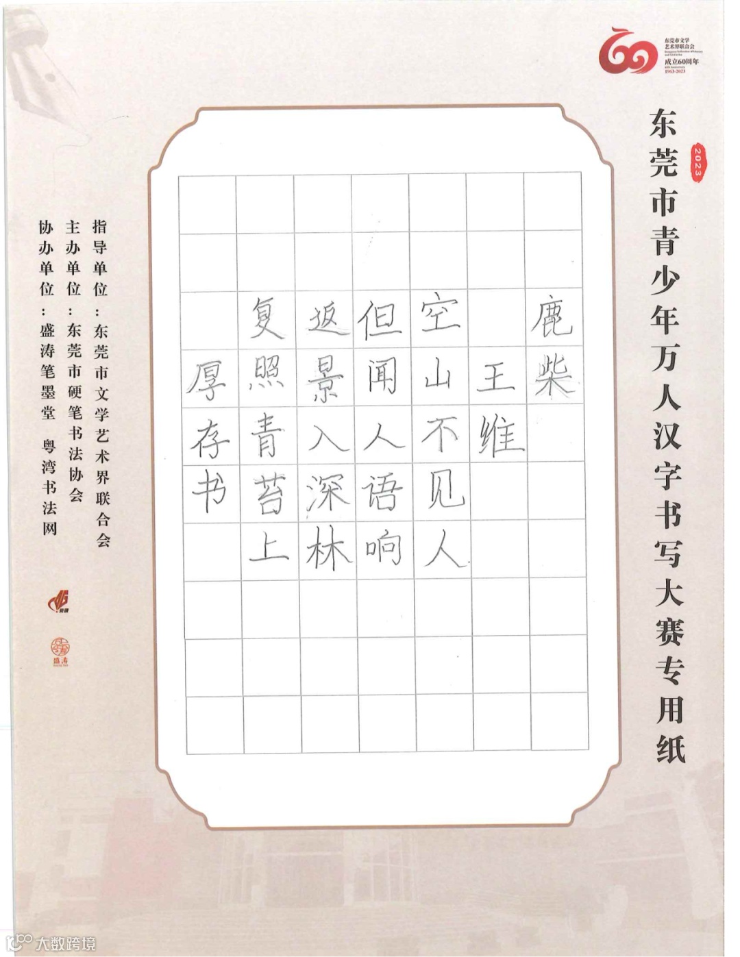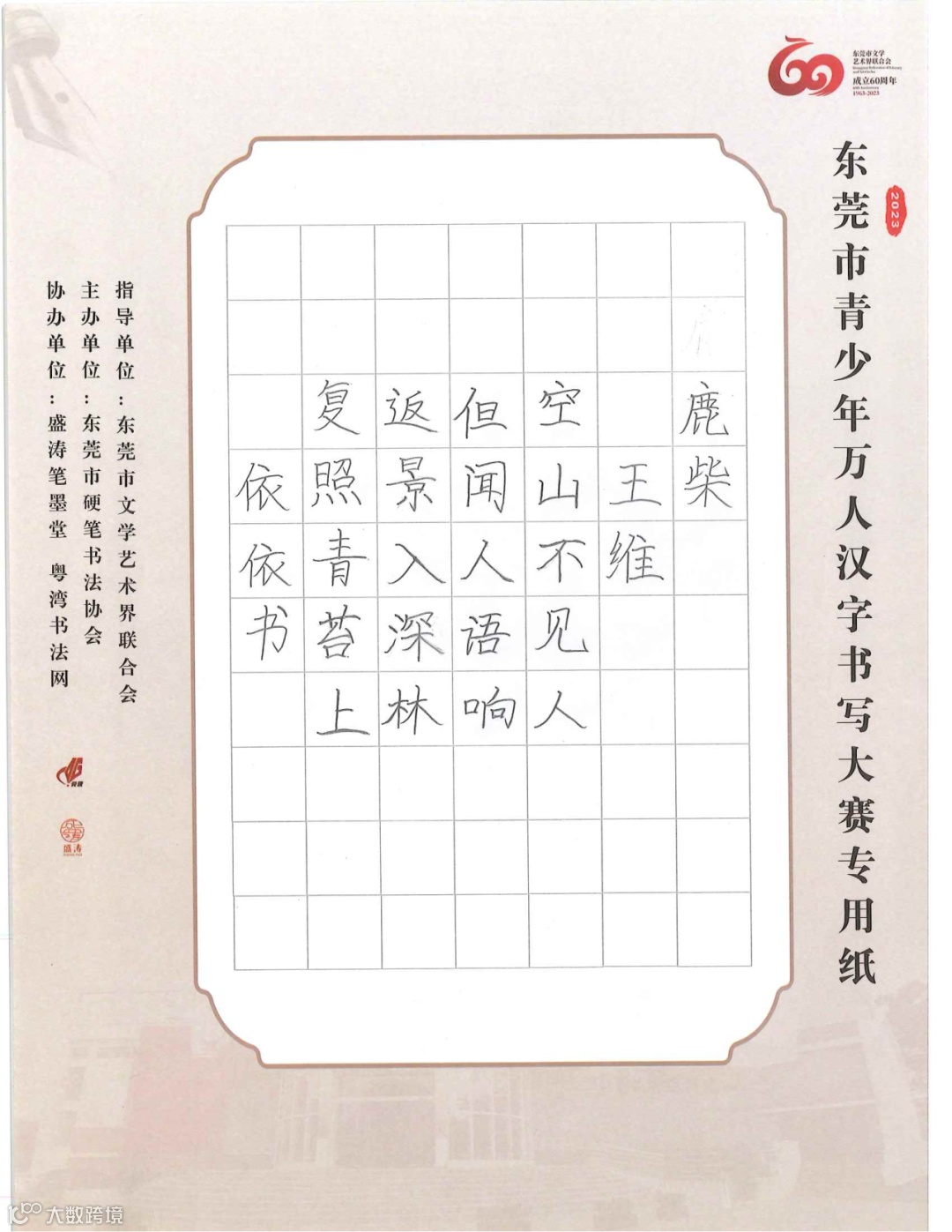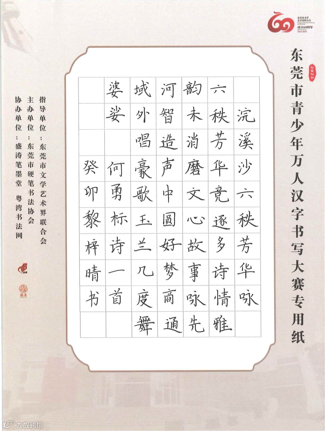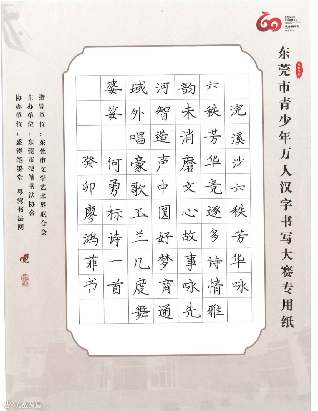 悠扬的古琴音乐声在赛场缓缓流淌,不知不觉地把同学们带入了一个淡雅宁静的创作状态之中。同学们“双姿”规范,“头正、身直、臂开、足平”。书写时,一丝不苟,横竖撇捺,起笔收笔,尽显笔锋。