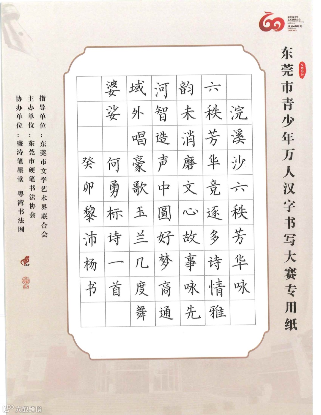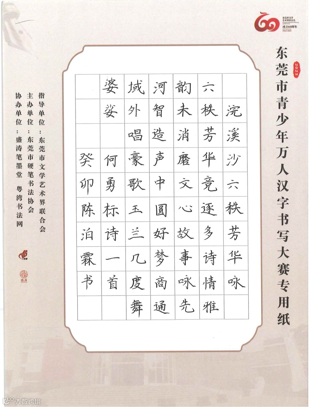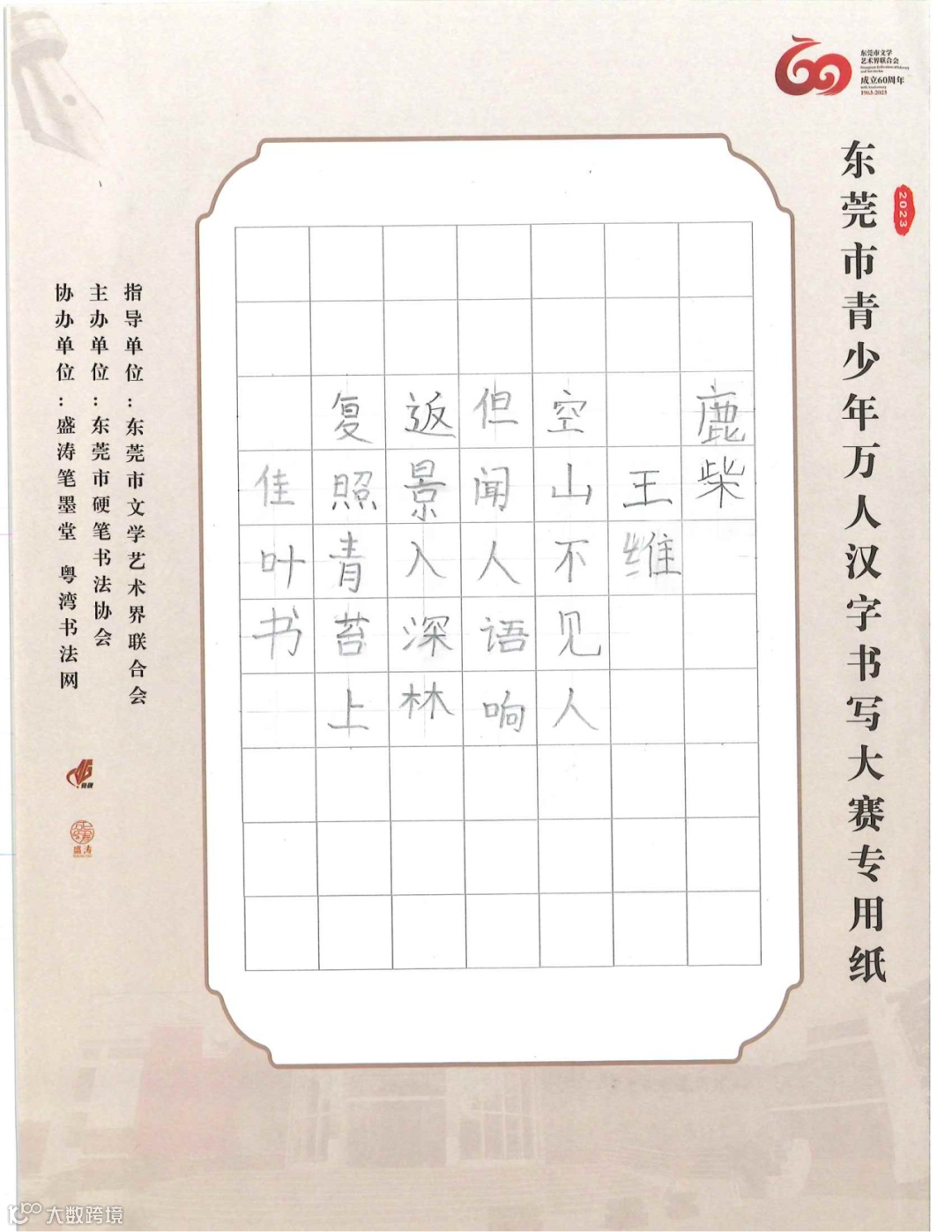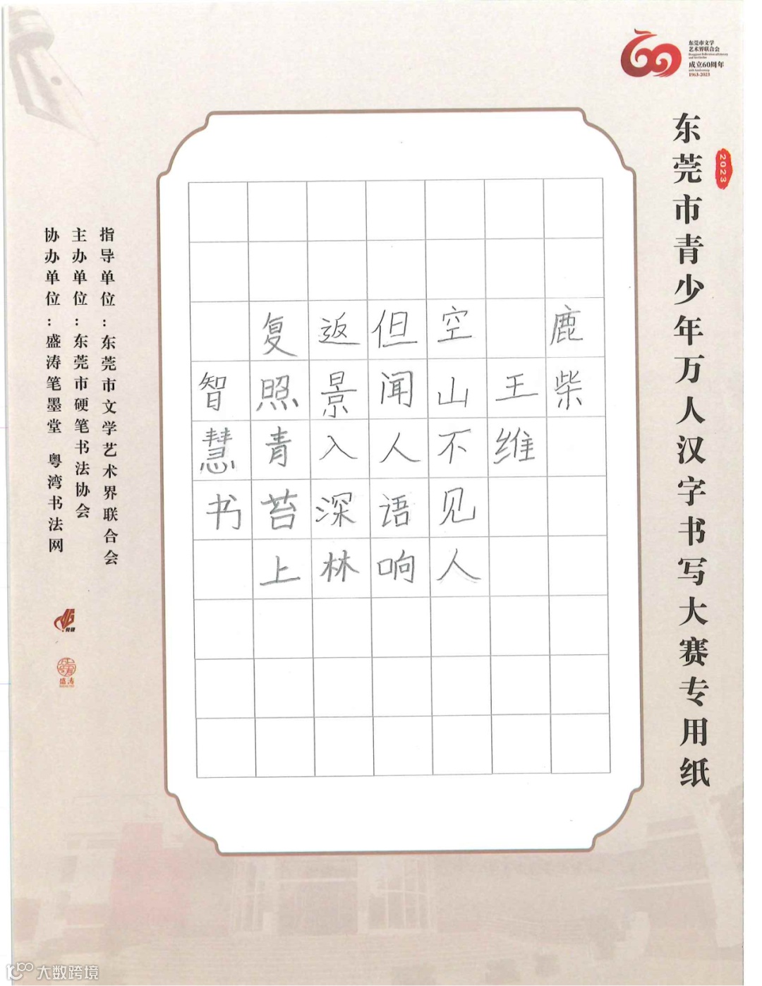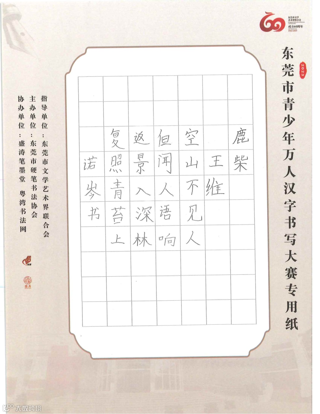 悠扬的古琴音乐声在赛场缓缓流淌,不知不觉地把同学们带入了一个淡雅宁静的创作状态之中。同学们“双姿”规范,“头正、身直、臂开、足平”。书写时,一丝不苟,横竖撇捺,起笔收笔,尽显笔锋。