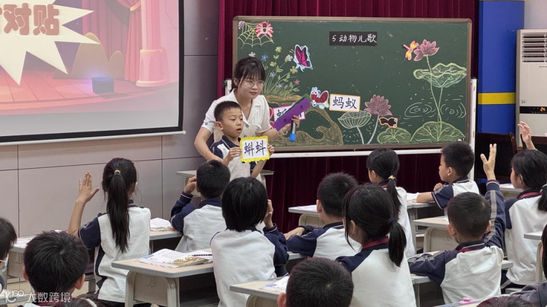 南城阳光一小的谢老师先是创设了“动物才艺大比拼”的情境,带领学生认识带有虫字旁的动物名字,引导学生发现动物名字的构字规律,并借助识字翻翻翻、识字转转转、识字刮刮乐等识字游戏帮助学生巩固识字。接着谢老师和学生一起进入“汉字魔法屋”去了解形声字的构成,并且拓展、积累更多的形声字。而后谢老师采用师生合作读、配乐读、表演读的多种朗读方式,引导学生在一遍遍的朗读中发现儿歌的句式结构“谁在什么地方干什么”。最后带领孩子按节奏、模仿动物动作再读儿歌。整堂课中,谢老师教态自然,语言亲切,时刻关注着孩子们的学习情况,课堂组织、引导、激励都非常有效。