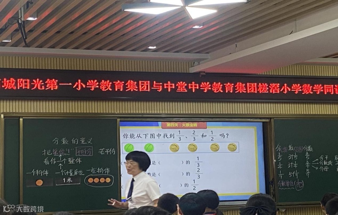 南城阳光一小的陈丽芳老师进行课例展示《分数的意义》。陈老师以几个核心问题贯穿整节课,通过“分的是什么?怎么分?数的是什么?”来串联各个知识间的联系,从丰富的学习内容中,让学生认识和概括单位“1”,分数单位等教学重难点。学生的学习情绪高涨,对答如流,全身心地参与到课堂学习中,教师十分注重对学生进行数学素养的培养。