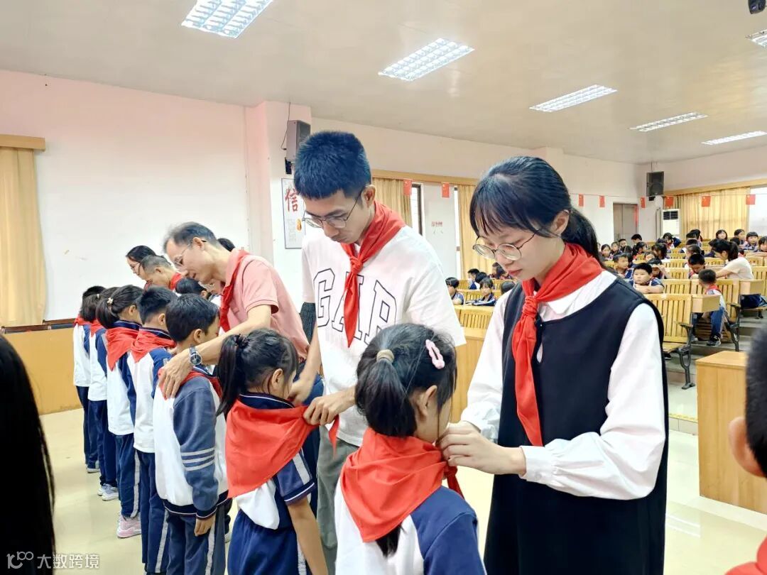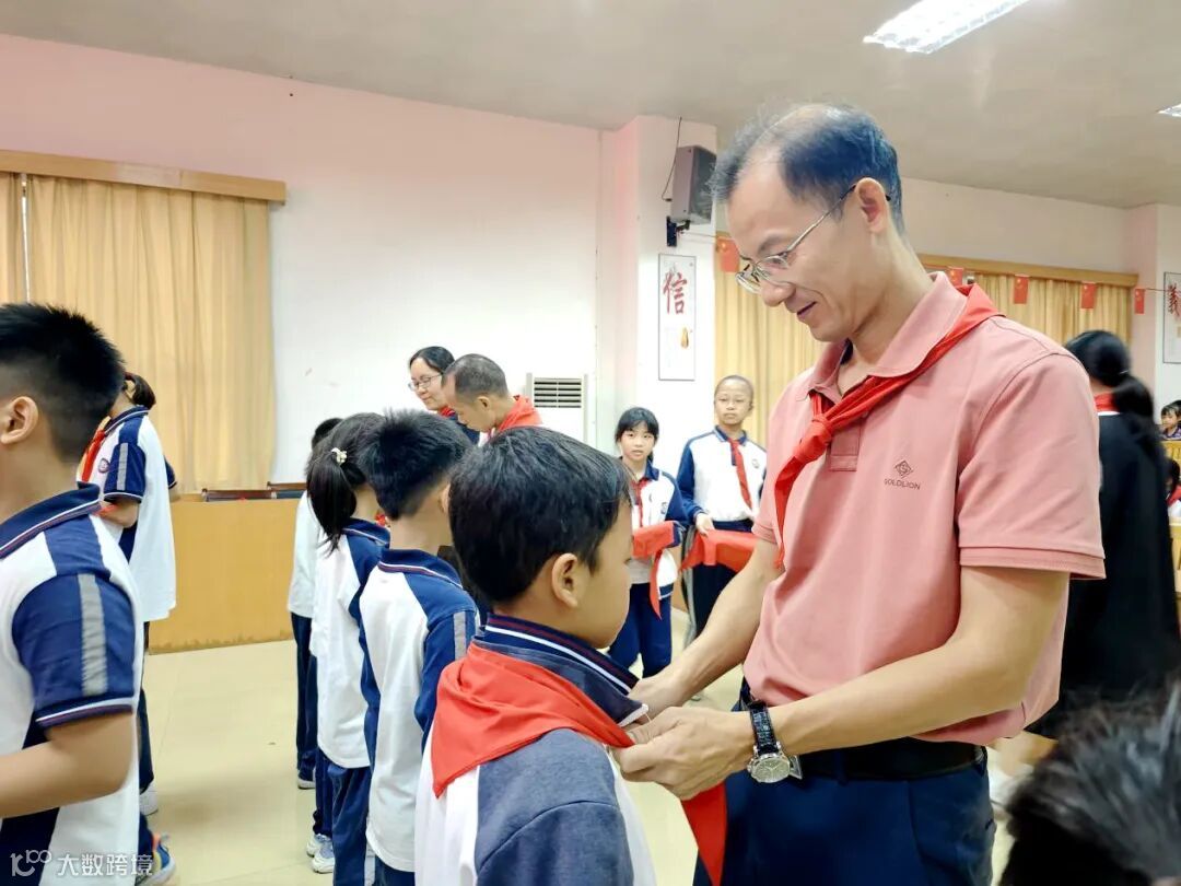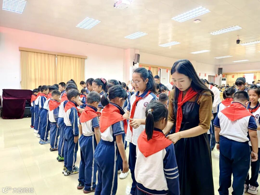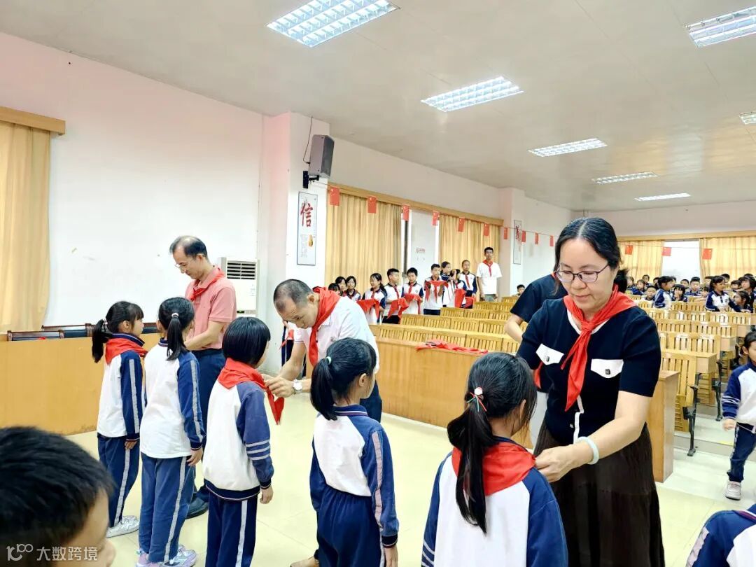 学校少工委主任杨金华、少工委副主任翁文伟、伍慧婵老师、大中队辅导员及五年级少先队干部,细心为二年级新队员佩戴红领巾。红领巾的传递,是精神的传承,是使命的传递。