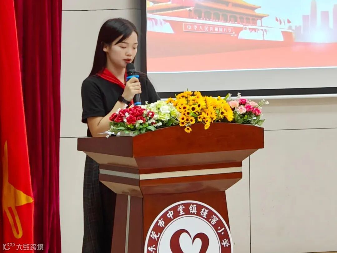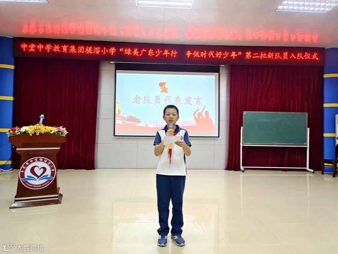 少先队大队辅导员肖玉婷老师宣读《关于批准新队员入队的决定》,中堂中学教育集团槎滘小学二年级共165名学生正式加入中国少年先锋队。