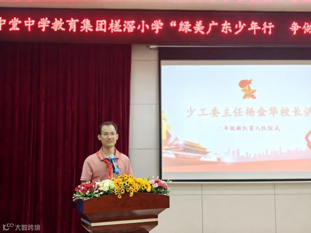少工委主任杨金华对新入队的队员们表示祝贺,并希望新队员能从小胸怀祖国,树立远大理想,做一个遵纪守法、诚实守信,积极向上的新时代好少年,在星星火炬旗帜的指引下茁壮成长!