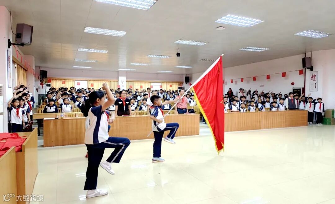 伴随着昂扬的旋律,旗手、护旗手迈着坚定的步伐昂首而至,队旗飘扬着,仿佛是一面指引前进方向的明灯,新队员们默默注视着熠熠生辉的旗帜,唱着整齐响亮的中国少年先锋队队歌。