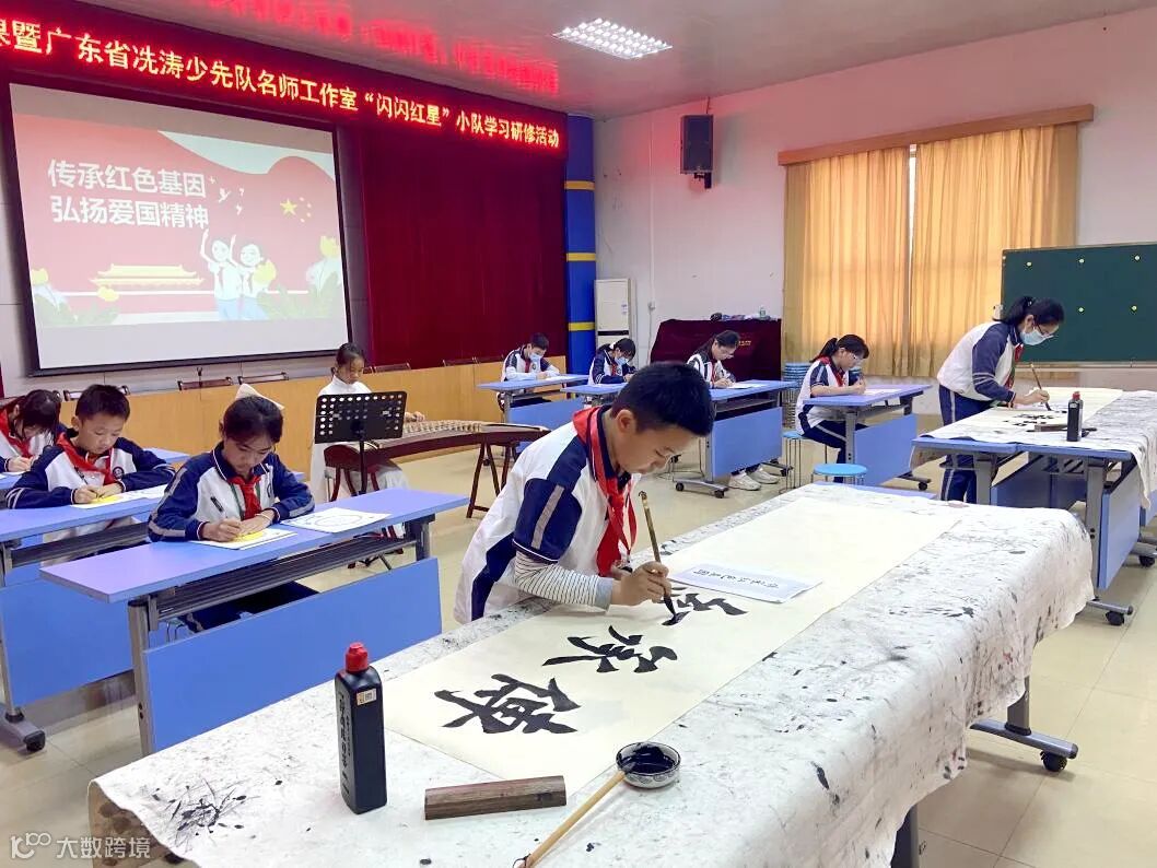 队课前,槎滘小学书法小社团进行了现场书法展示。春暖花开,淡淡墨香,队员们全神贯注,认真进行书写,点撇横捺,潇洒挥笔书写着精美的字体,大家低头奋笔疾书的样子形成了一道亮丽的风景线。