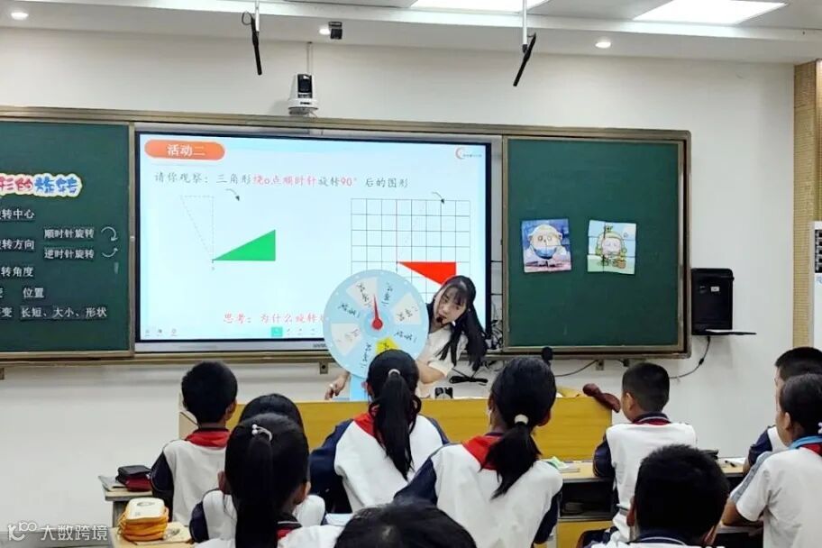 欧燕兰老师整个课堂注重引导学生联系生活经验,在具体情境中进一步认识图形的旋转。教学时,她以核心问题为驱动,通过小组合作方式让学生在操作中理解旋转的三要素,并能结合旋转三要素描述图形旋转的过程。