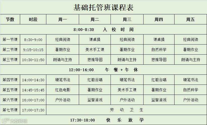 2.基础托管半天班:上课时间:上午8:30-12:00或者下午14:00-17:30,收费标准:300元/期(不含午餐午休);