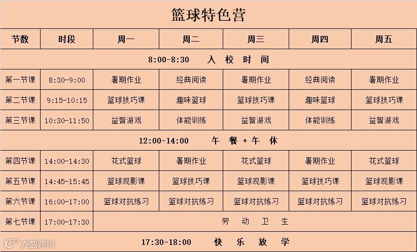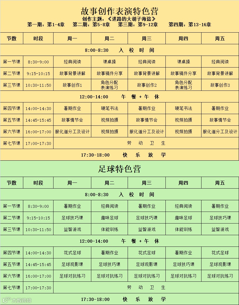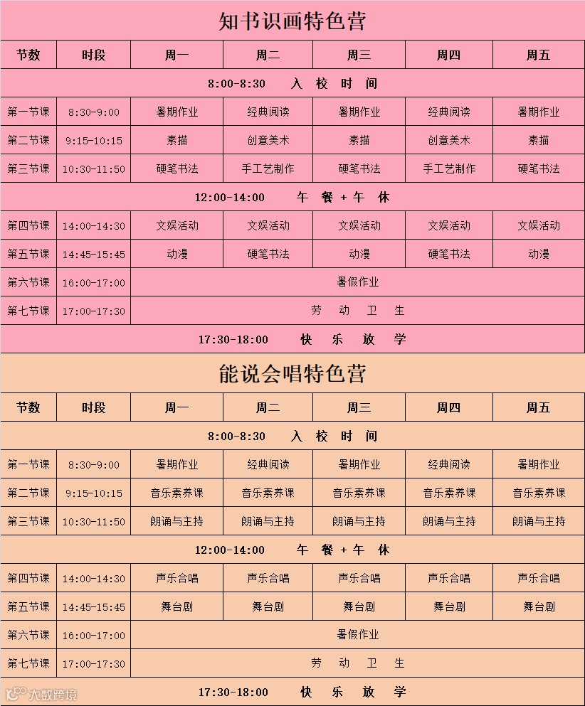 3.特色托管全天班:上课时间:8:30-17:30,收费标准:600元/期(不含午餐午休);特色营因课程连贯性,不设置半天课程;