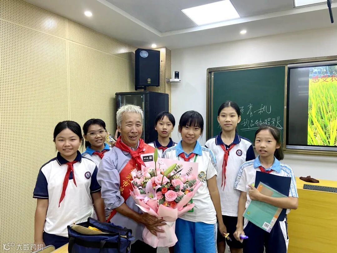 陈志坚爷爷与队员们一起分享稻谷的秘密,向队员们讲述自己和水稻的故事。让队员们在讲座中感受劳动的艰辛和丰收的喜悦,引导队员们从小崇尚科学家精神,同时告诉我们要感恩党、跟党走。
