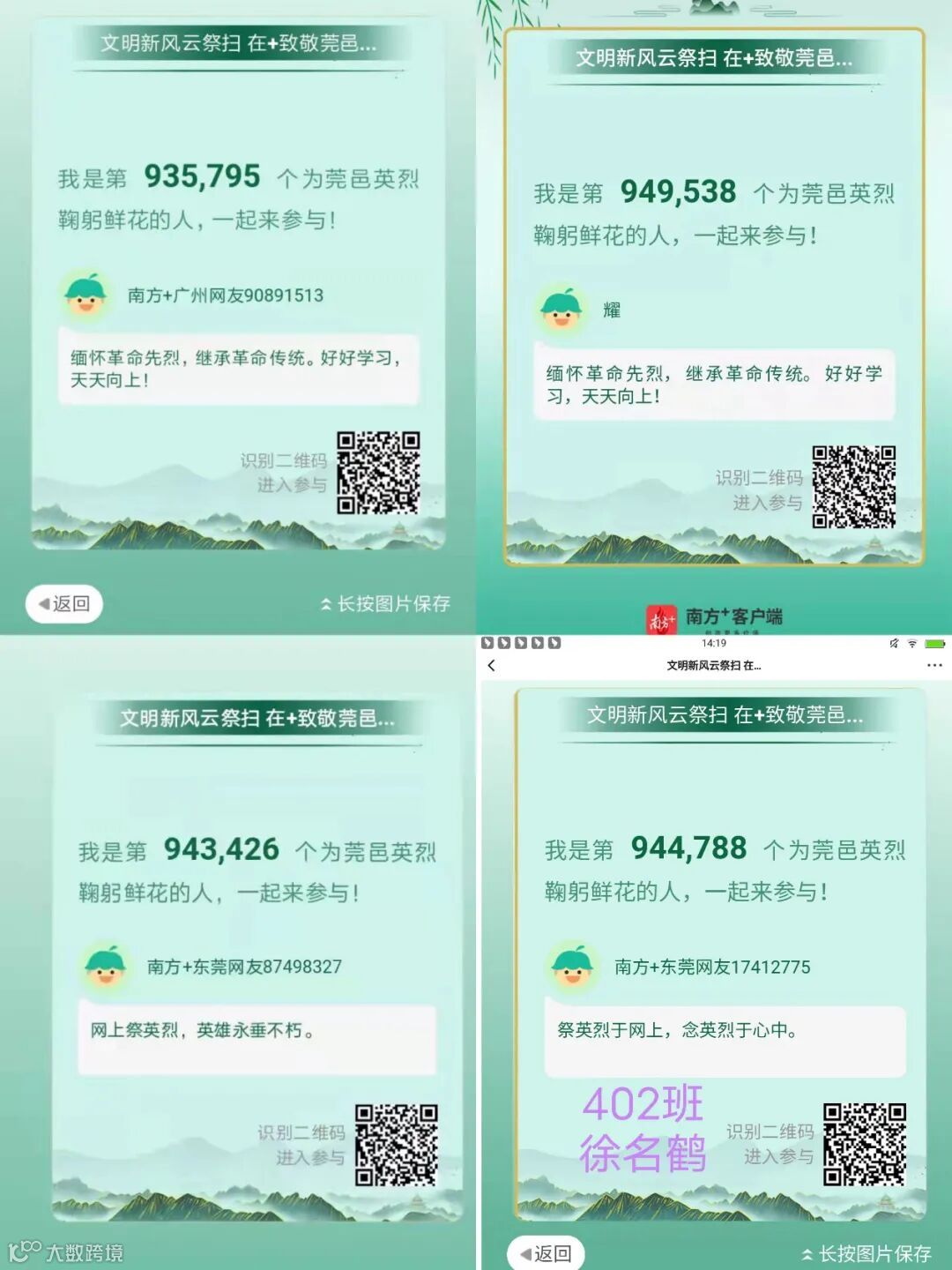 组织全体少先队员开展由东莞市文明办指导,共青团东莞市委员会、东莞市退役军人事务局和南方报业传媒集团东莞分社主办的“文明新风云祭扫 在+致敬莞邑英烈”网上祭扫活动,队员们线上通过网上献花、发表祭奠感言来缅怀历史丰功伟绩,表达对英烈的感恩和敬仰。